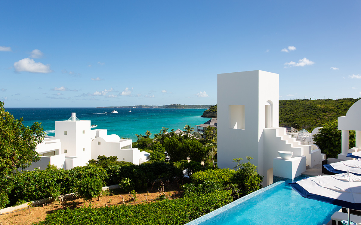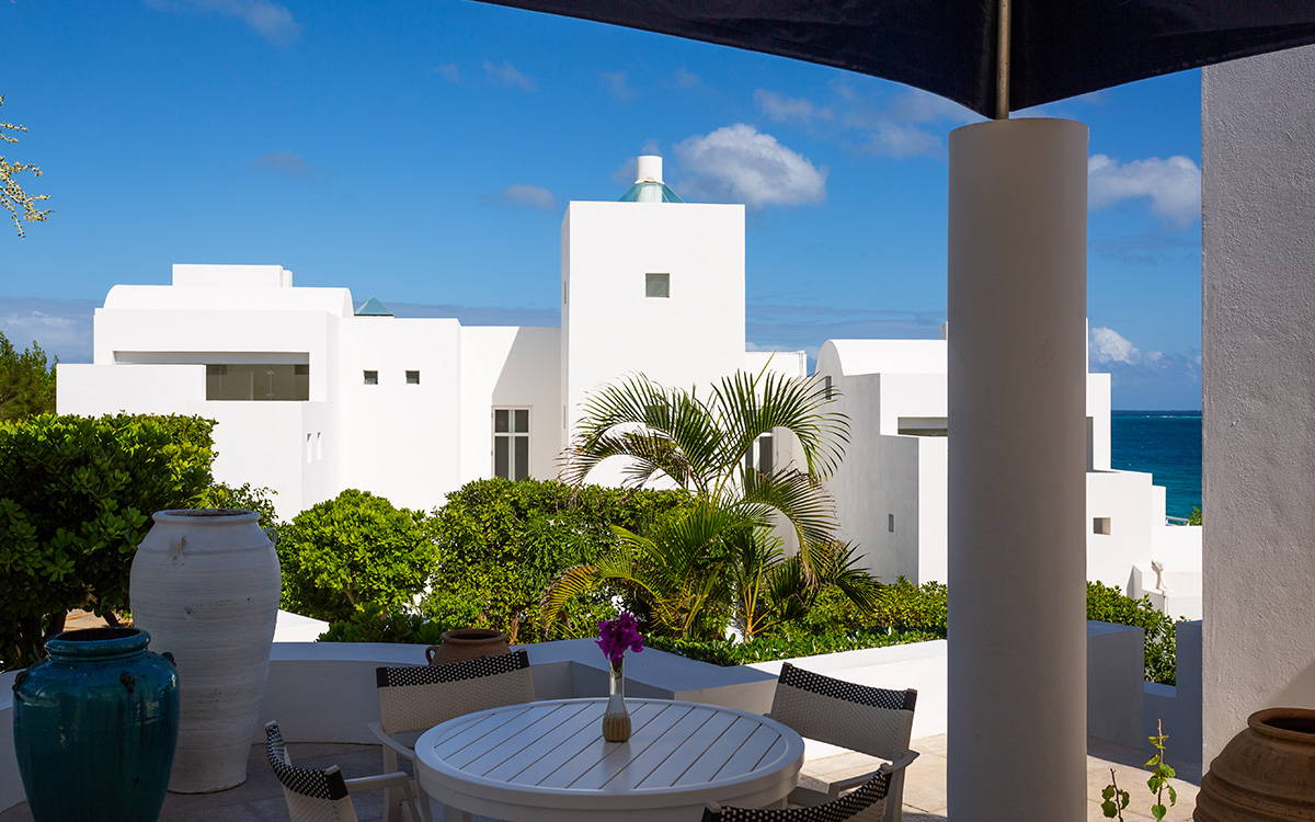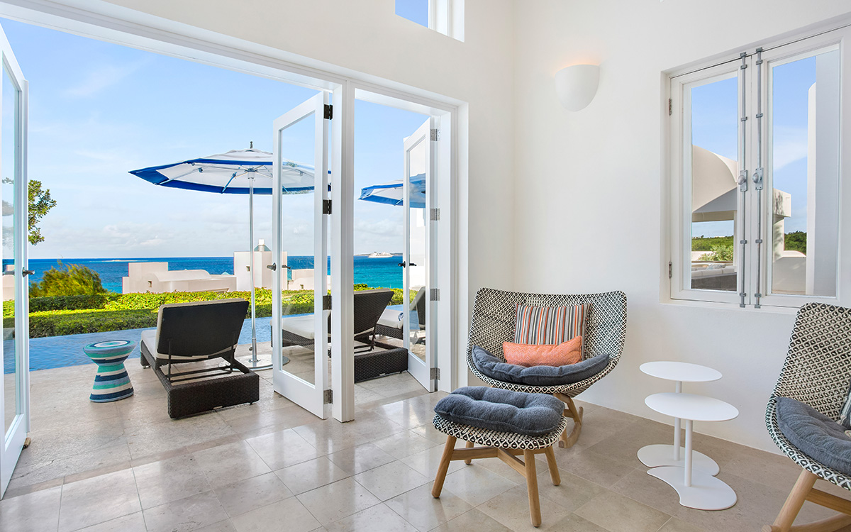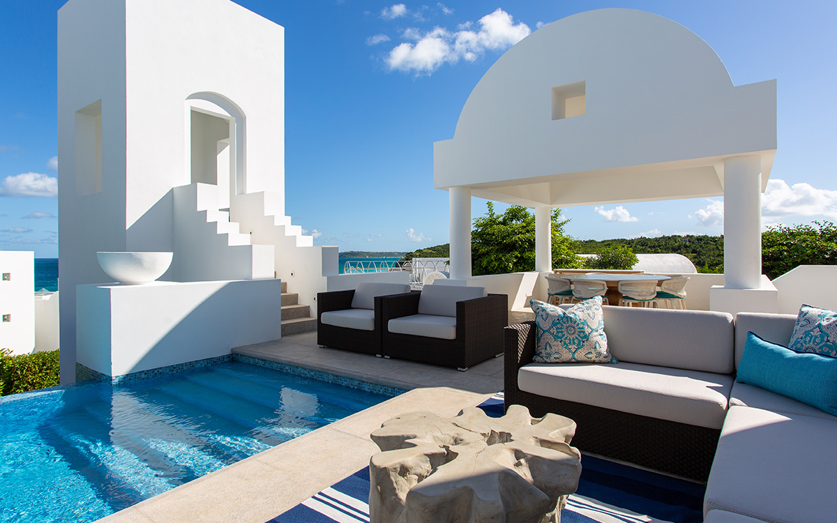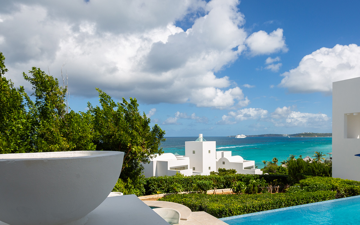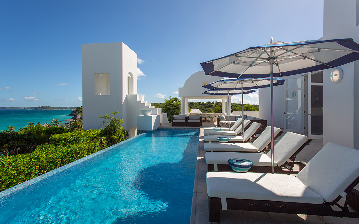 Set atop the highest point of the oceanfront grounds, the villa features spectacular views and a calming color theme sets an ethereal tone throughout its 5,500 square feet of sweeping space. A splendid white beach complements the exemplary amenities and service offered at this island sanctuary.Greek architectural influences include serene geometric shapes, pristine white exteriors and dramatic appointments. A courtyard highlighted by a reflecting pool leads to the villa’s entry hall. Two levels of interiors connected by a striking circular stairway are naturally lit by pyramid skylights and glass doors, and feature elegant furnishings set on polished marble floors. The main floor hosts a spacious living room with formal dining area opening to the pool terrace and breathtaking views of the sea. Also on the main floor is a powder room, and a contemporary kitchen with Kashmir granite floor and countertops, center preparation island, double oven, Sub-Zero refrigerator and ceiling-high pantry with ladder. The kitchen opens to a perfect alfresco dining pavilion with grill set next to the pool.Two of the villa’s four impeccable master bedroom suites are found on the first floor, with one enjoying private access to the pool terrace. Two further suites are located on the second floor, each boasting a private terrace, one with steps leading to the pool area. All suites feature sitting areas and indoor/outdoor white marble en-suites with double bath and basins, freestanding shower, bidet, and separated by glass, a large outdoor shower.These accommodations are complemented by a second floor atelier facing the sea and furnished as an office, a choice of secluded spaces inspiring reflection, a perfect meditation tower, a Jacuzzi placed at the terrace’s edge, and private stairway to the beach below.Continental breakfast is served daily. Guests are greeted at the airport or ferry by their personal butler. A full complement of staff can assist with requests and arrangements, including in-villa spa treatments, yoga, personal fitness training and cooking classes.Please note: Apart from the daily continental breakfast, food and beverages are not included in the rates for this villa.The villa is steps from the beach via a private stairway and 20 minutes from shopping and the airport. Guests share a fitness center fully outfitted with the latest equipment, and three tennis courts lit for evening play. Kayaking is available on site, and other watersports, such as snorkeling, scuba diving, sailing and fishing, are easily accessible.