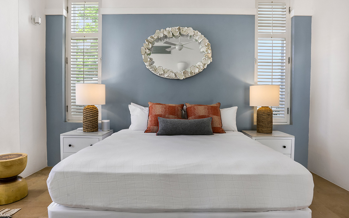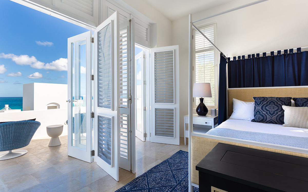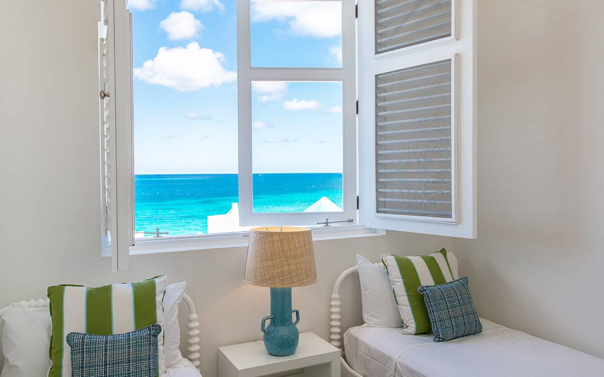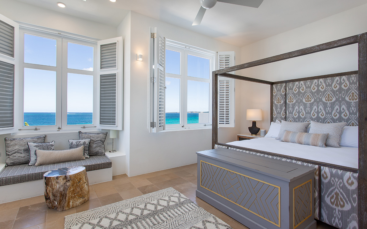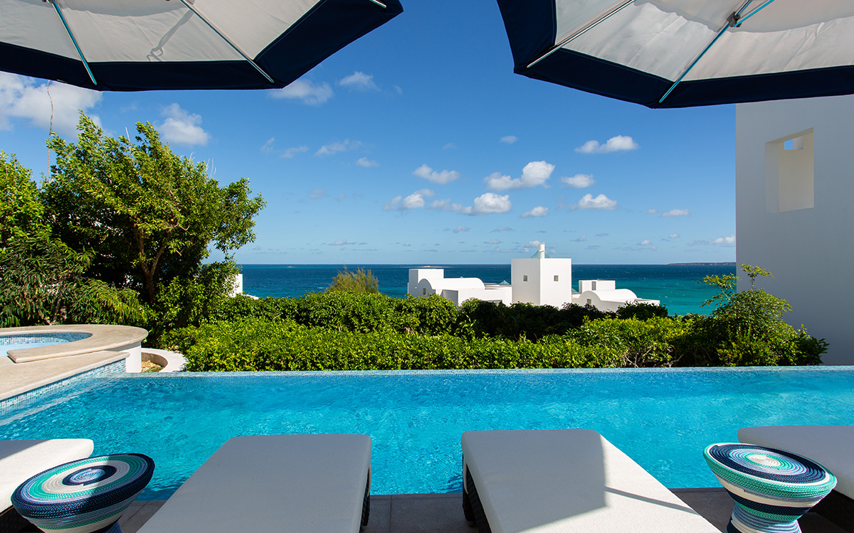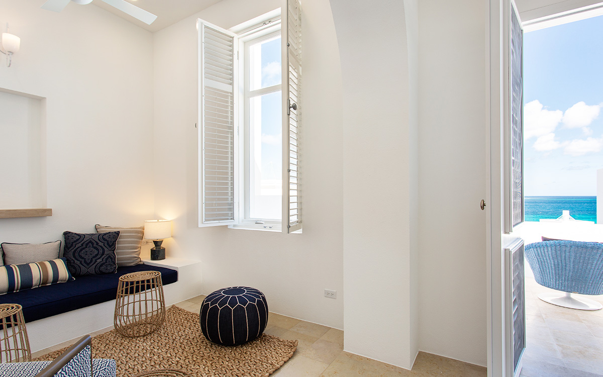 Set atop the highest point of the oceanfront grounds, the villa features spectacular views and a calming color theme sets an ethereal tone throughout its 5,500 square feet of sweeping space. A splendid white beach complements the exemplary amenities and service offered at this island sanctuary.Greek architectural influences include serene geometric shapes, pristine white exteriors and dramatic appointments. A courtyard highlighted by a reflecting pool leads to the villa’s entry hall. Two levels of interiors connected by a striking circular stairway are naturally lit by pyramid skylights and glass doors, and feature elegant furnishings set on polished marble floors. The main floor hosts a spacious living room with formal dining area opening to the pool terrace and breathtaking views of the sea. Also on the main floor is a powder room, and a contemporary kitchen with Kashmir granite floor and countertops, center preparation island, double oven, Sub-Zero refrigerator and ceiling-high pantry with ladder. The kitchen opens to a perfect alfresco dining pavilion with grill set next to the pool.Two of the villa’s four impeccable master bedroom suites are found on the first floor, with one enjoying private access to the pool terrace. Two further suites are located on the second floor, each boasting a private terrace, one with steps leading to the pool area. All suites feature sitting areas and indoor/outdoor white marble en-suites with double bath and basins, freestanding shower, bidet, and separated by glass, a large outdoor shower.These accommodations are complemented by a second floor atelier facing the sea and furnished as an office, a choice of secluded spaces inspiring reflection, a perfect meditation tower, a Jacuzzi placed at the terrace’s edge, and private stairway to the beach below.Continental breakfast is served daily. Guests are greeted at the airport or ferry by their personal butler. A full complement of staff can assist with requests and arrangements, including in-villa spa treatments, yoga, personal fitness training and cooking classes.Please note: Apart from the daily continental breakfast, food and beverages are not included in the rates for this villa.The villa is steps from the beach via a private stairway and 20 minutes from shopping and the airport. Guests share a fitness center fully outfitted with the latest equipment, and three tennis courts lit for evening play. Kayaking is available on site, and other watersports, such as snorkeling, scuba diving, sailing and fishing, are easily accessible.