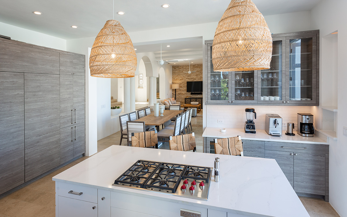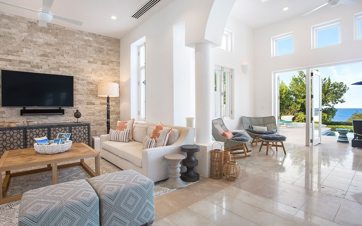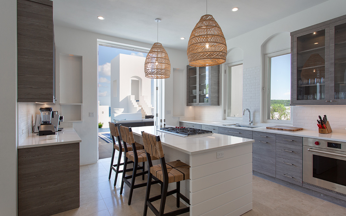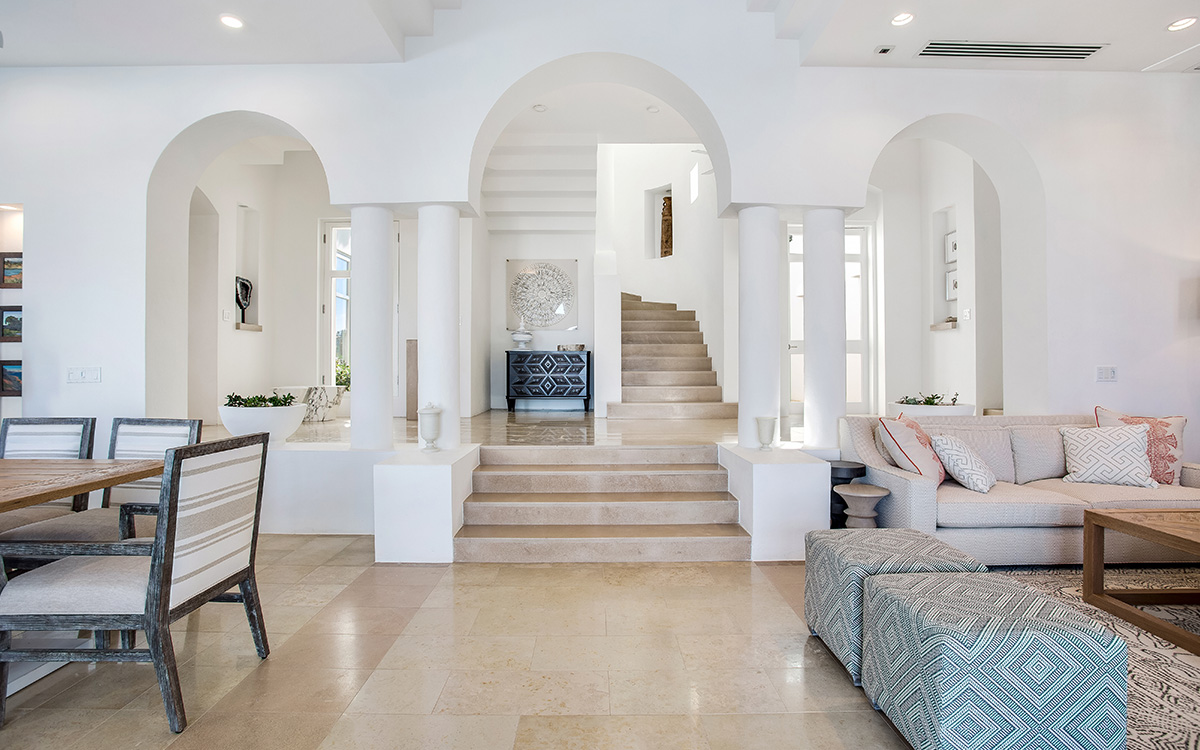 Set atop the highest point of the oceanfront grounds, the villa features spectacular views and a calming color theme sets an ethereal tone throughout its 5,500 square feet of sweeping space. A splendid white beach complements the exemplary amenities and service offered at this island sanctuary.Greek architectural influences include serene geometric shapes, pristine white exteriors and dramatic appointments. A courtyard highlighted by a reflecting pool leads to the villa’s entry hall. Two levels of interiors connected by a striking circular stairway are naturally lit by pyramid skylights and glass doors, and feature elegant furnishings set on polished marble floors. The main floor hosts a spacious living room with formal dining area opening to the pool terrace and breathtaking views of the sea. Also on the main floor is a powder room, and a contemporary kitchen with Kashmir granit..