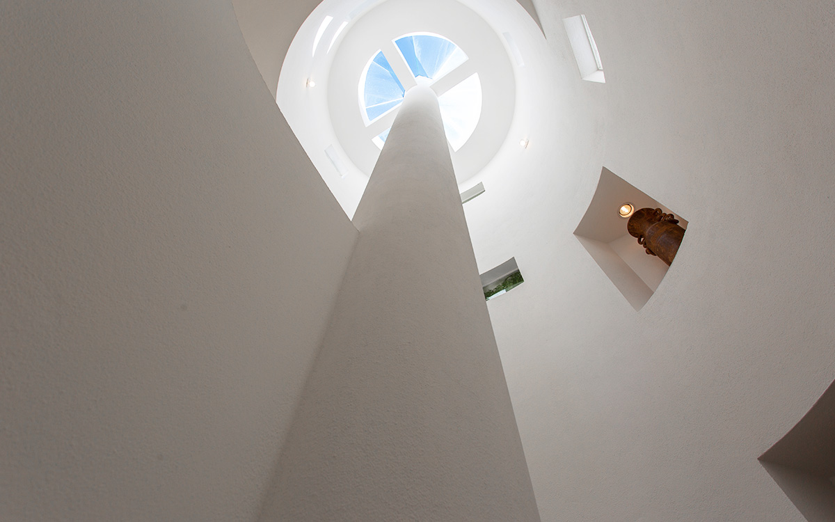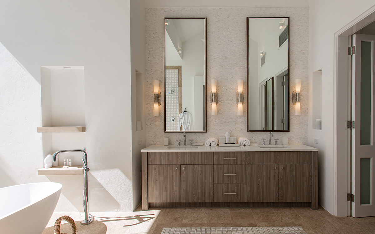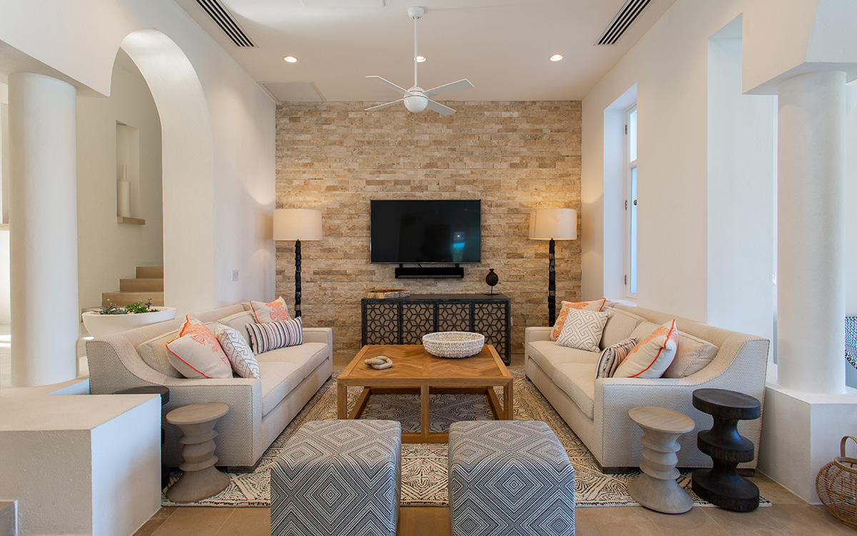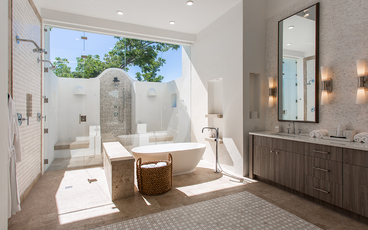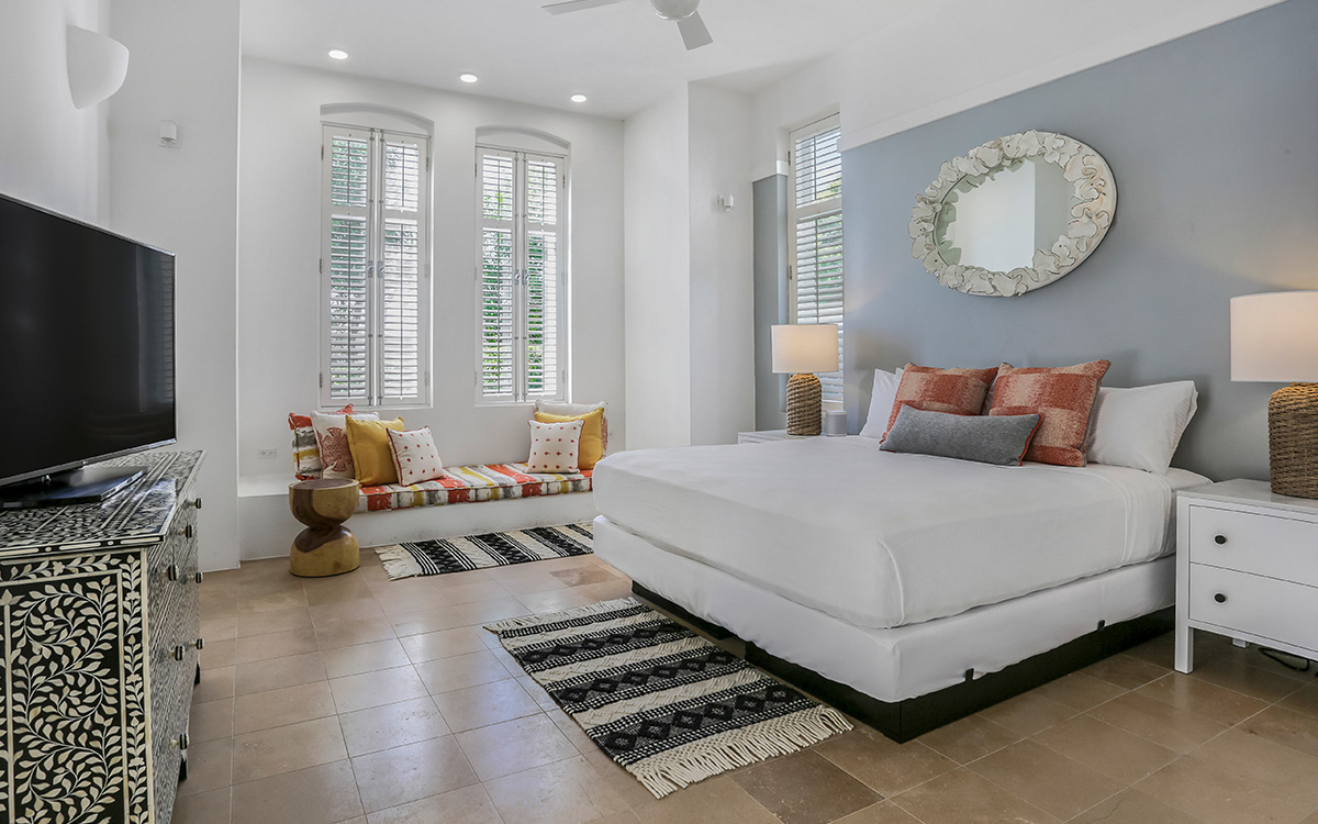 Set atop the highest point of the oceanfront grounds, the villa features spectacular views and a calming color theme sets an ethereal tone throughout its 5,500 square feet of sweeping space. A splendid white beach complements the exemplary amenities and service offered at this island sanctuary.Greek architectural influences include serene geometric shapes, pristine white exteriors and dramatic appointments. A courtyard highlighted by a reflecting pool leads to the villa’s entry hall. Two levels of interiors connected by a striking circular stairway are naturally lit by pyramid skylights and glass doors, and feature elegant furnishings set on polished marble floors. The main floor hosts a spacious living room with formal dining area opening to the pool terrace and breathtaking views of the sea. Also on the main floor is a powder room, and a contemporary kitchen with Kashmir granit..
