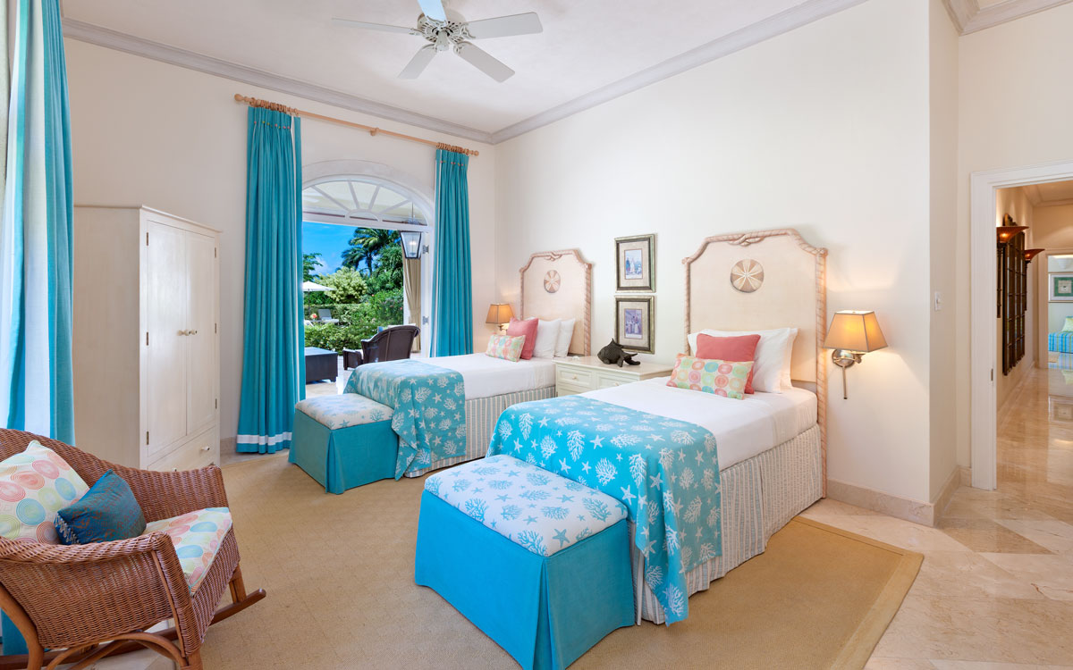 | Bedroom 2 | 2 Twins | Coral Shell - located in ground floor of main house, a/c, en-suite bathroom w/ double basins, walk-in shower, separate WC. |