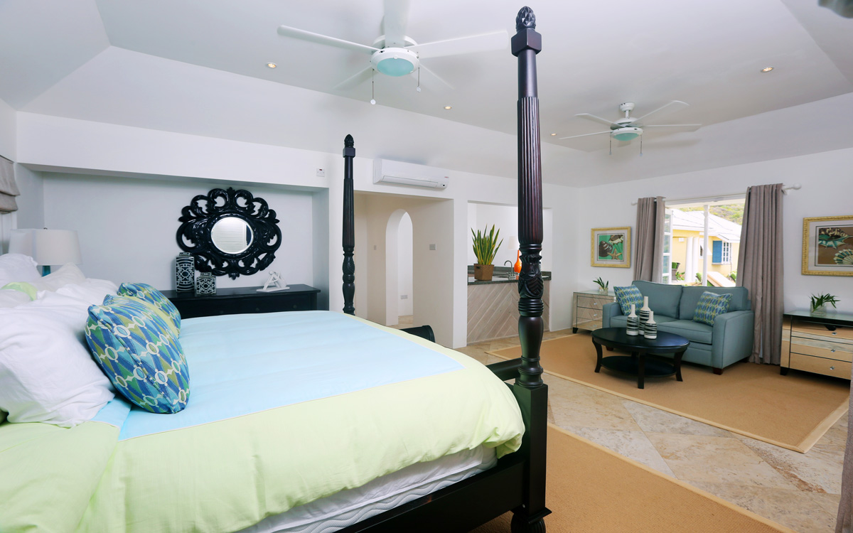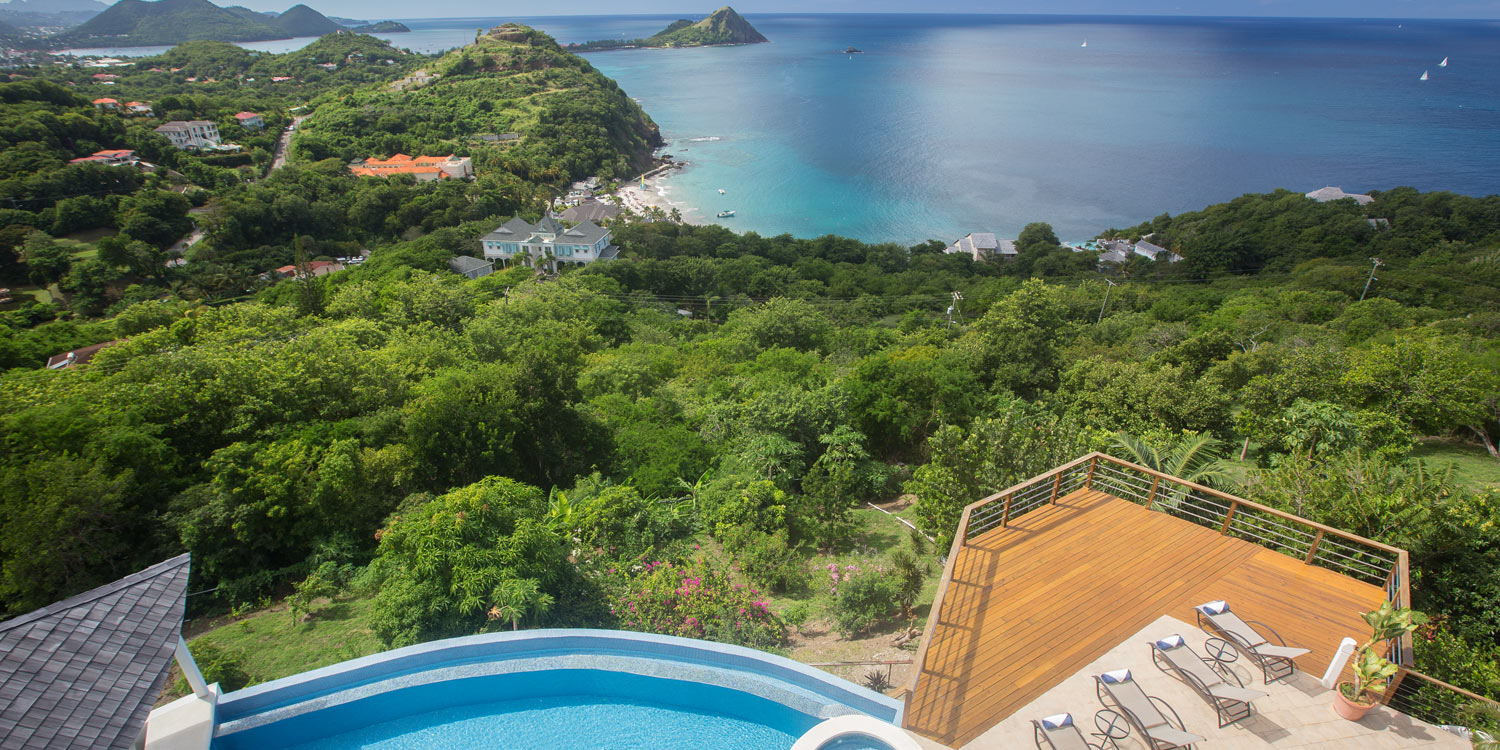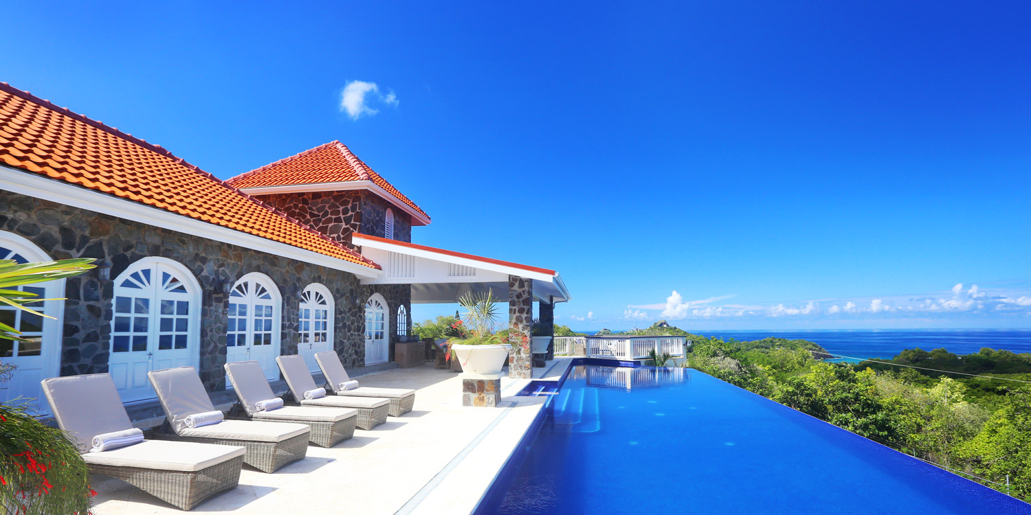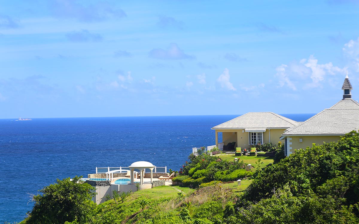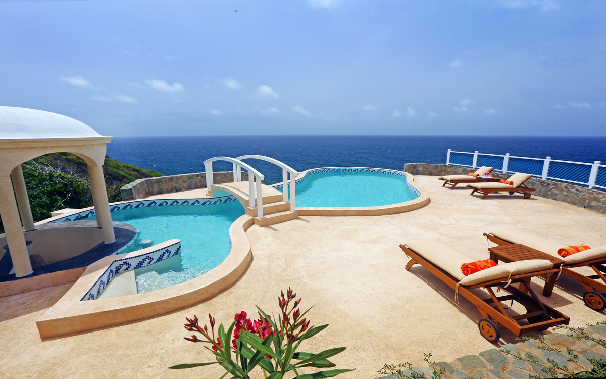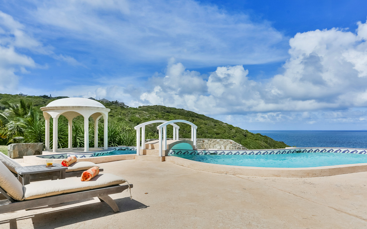 The villa occupies a privileged position in the Sea Breeze Hills at Cap Estate, providing uninterrupted sea vistas and sublime privacy. Recently constructed, the property offers an inspired combination of modernity and Caribbean tradition.A freeform swimming pool with a bridge accent, poolside gazebo and a swim-up bar is surrounded by spacious decking. A romantic private plunge pool is also located off of the master bedroom. Spacious indoors and out, the villa is designed to provide opportunities for both privacy and communal gatherings.Large French windows and cathedral ceilings add a feeling of airiness with lots of light. Open-plan interiors include a double living room, indoor dining and a fully-equipped kitchen, opening to the deck terrace that overlooks the pool and views.Four bedrooms, each with en-suite bathroom and sea views, can comfortably host eight adults.Family friendly, spacious and private, the villa is also conveniently located within easy driving distance of beaches, shopping and dining venues, and golf facilities.