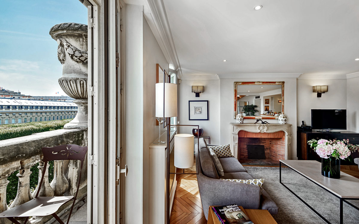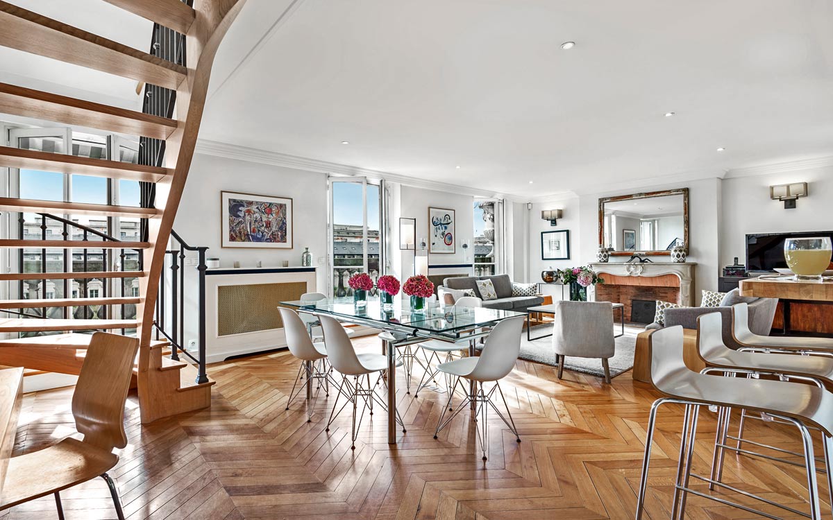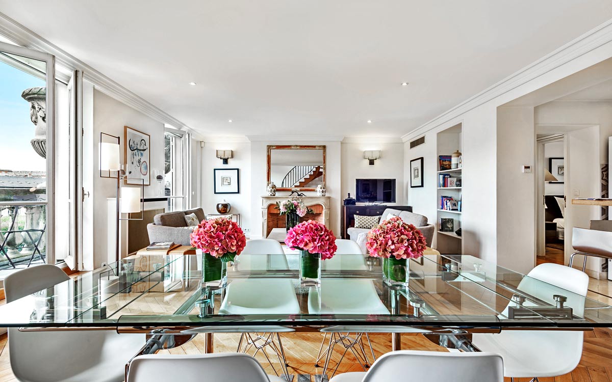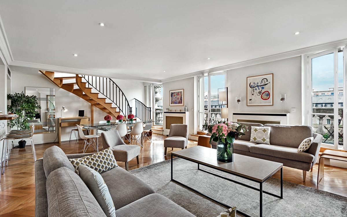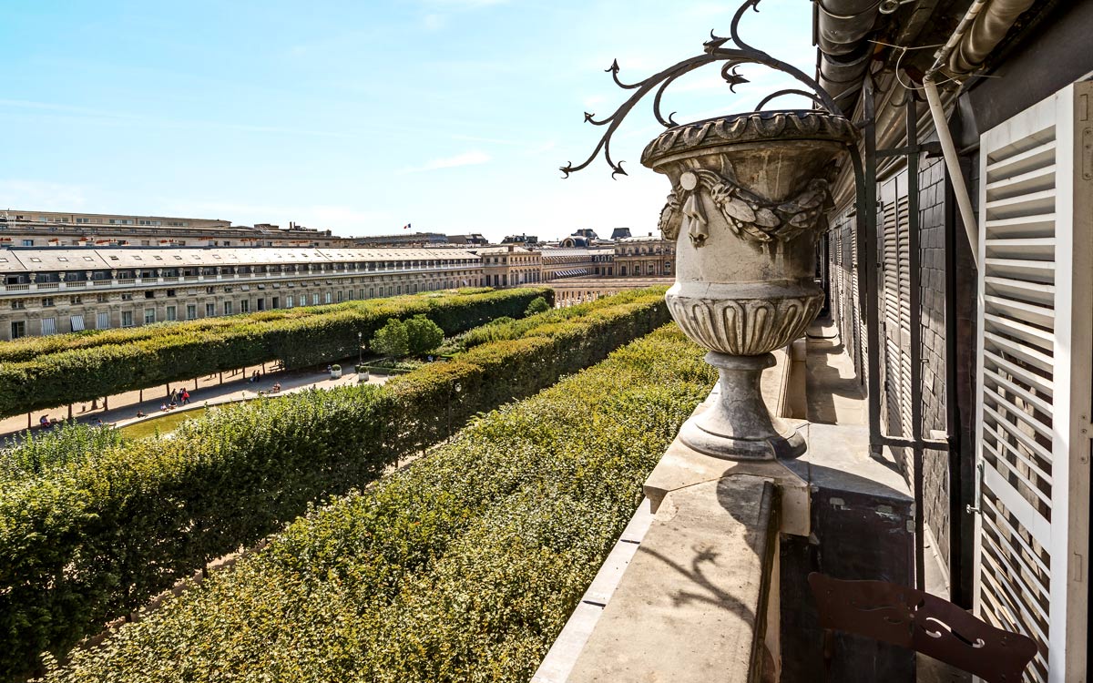 Located in the heart of Paris and just moments away from the gardens of the Louvre Museum, Dans les Jardins is situated in the original Palais Royal which was constructed in the 17th century. Only a short walk away are famous attractions, such as the Tuilerie Gardens, the Seine, the Place des Victoires and Place de la Concorde. Just a two minute walk away is the Metro. A bus stop and taxi stand are just around the corner. Dining venues, bars, bakeries and patisseries are conveniently close by.An elevator takes you to the third floor. The apartment is reached via a flight of stairs. Stretched across two levels, the Dans les Jardins features 140 square meters (1507 square feet) of comfortable living space. On the first floor, the open concept living room shares space with the dining area for eight people and allows easy access to the fully equipped kitchen. A large balcony overlook..