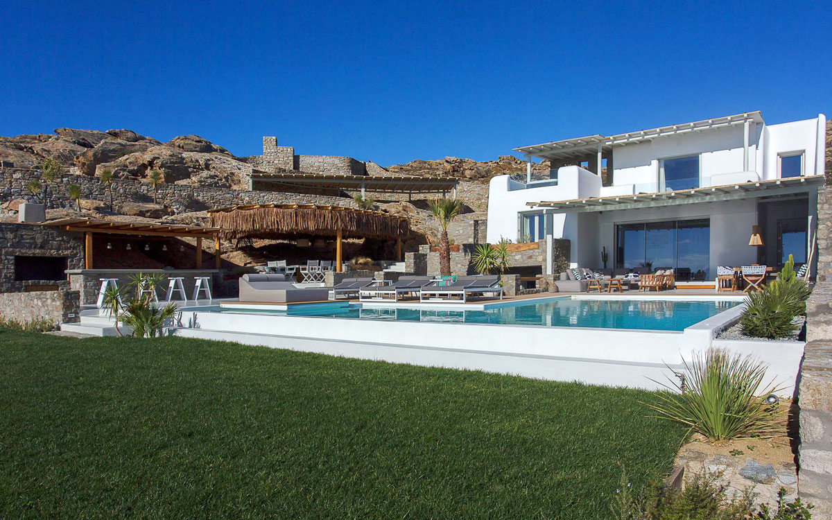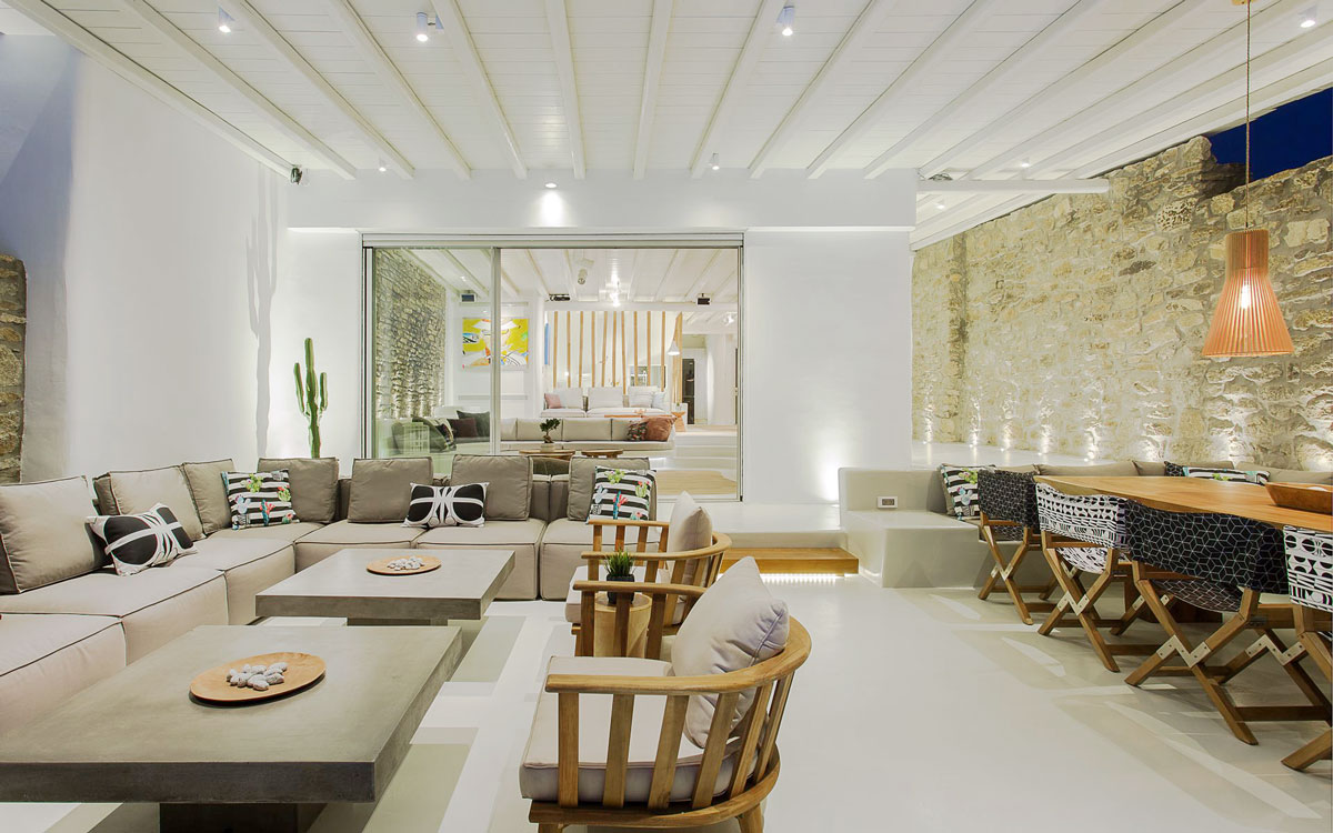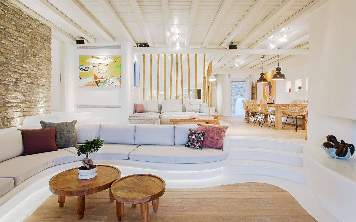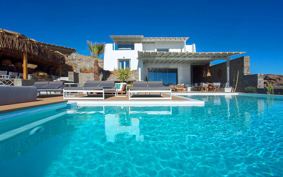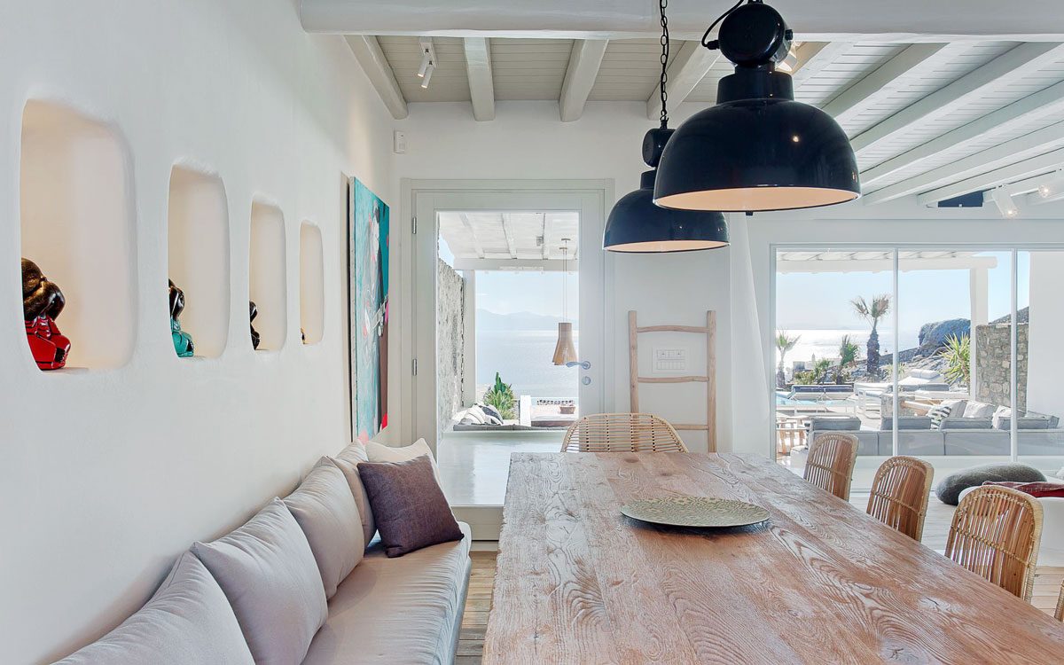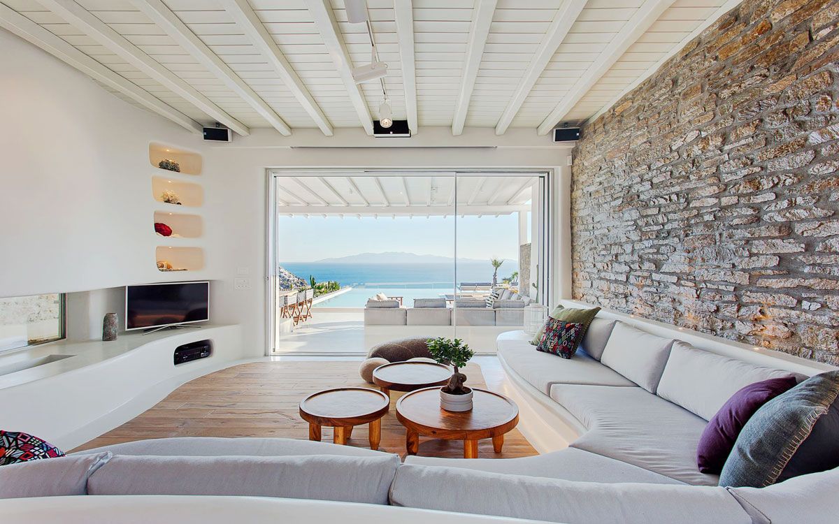 This stunning seven-bedroom property is an alluring mix of panoramic views and elegant design – the perfect Mykonos summer retreat for families and groups of friends. Even larger groups can also rent the neighboring villa, which boasts the same luxury standards.Outdoor spaces are designed to combine style and comfort.. The 75-square-meter infinity pool stretches out towards the panoramic view, surrounded by a sunbathing deck. Two distinct dining areas, a lounge spot and an attractive bar are also found on the front terrace, making this space the perfect all-day hangoutIndoors, every detail is masterfully executed, from the choice of the natural elements to the lighting fixtures. A minimalist approach that doesn’t neglect comfort nor amenities, either in the common spaces or the bedrooms with en-suite bathrooms. A few, unique final touches include the gym, sauna and the mast..