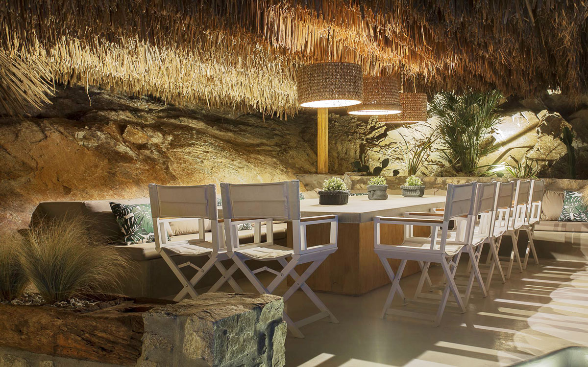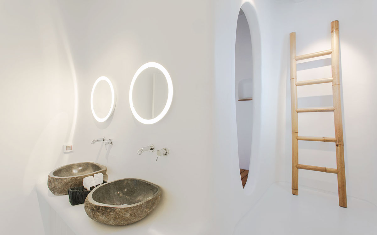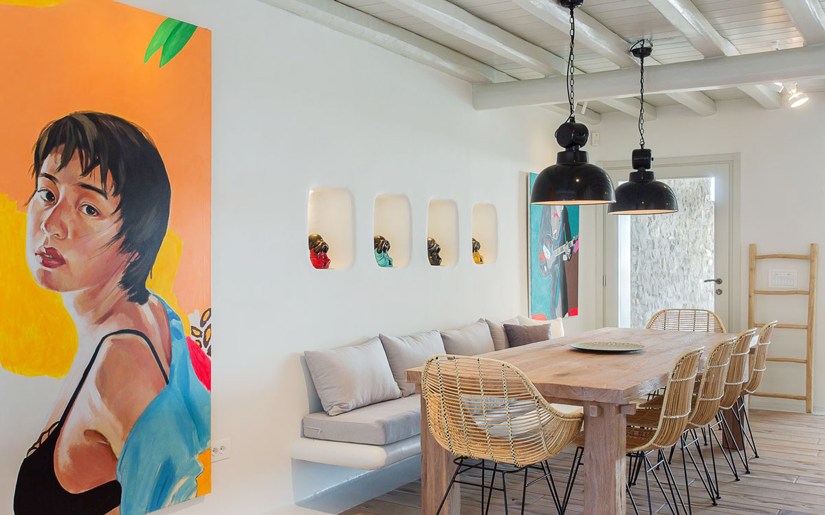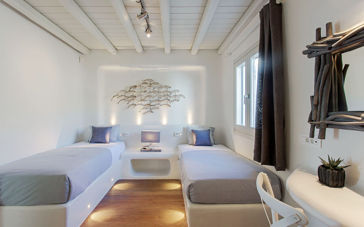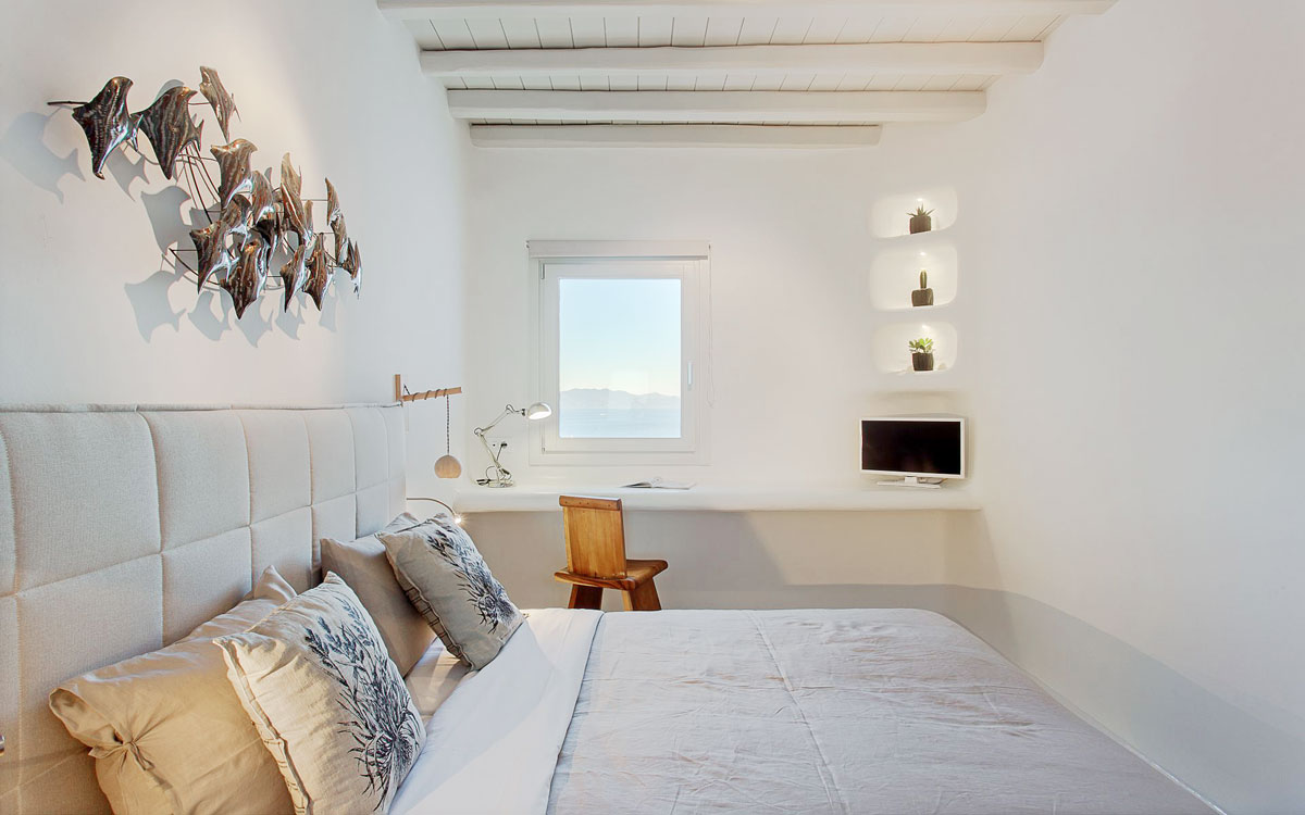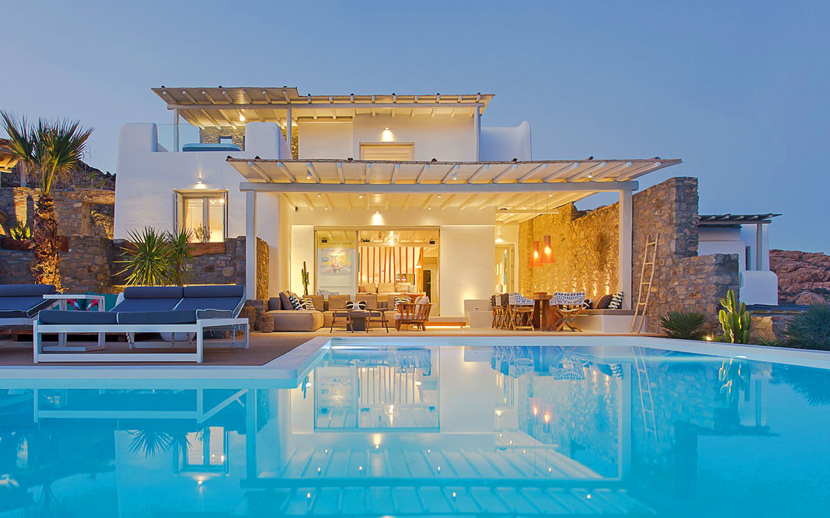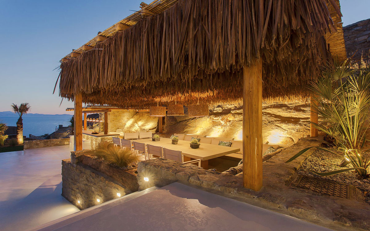 This stunning seven-bedroom property is an alluring mix of panoramic views and elegant design – the perfect Mykonos summer retreat for families and groups of friends. Even larger groups can also rent the neighboring villa, which boasts the same luxury standards.Outdoor spaces are designed to combine style and comfort.. The 75-square-meter infinity pool stretches out towards the panoramic view, surrounded by a sunbathing deck. Two distinct dining areas, a lounge spot and an attractive bar are also found on the front terrace, making this space the perfect all-day hangoutIndoors, every detail is masterfully executed, from the choice of the natural elements to the lighting fixtures. A minimalist approach that doesn’t neglect comfort nor amenities, either in the common spaces or the bedrooms with en-suite bathrooms. A few, unique final touches include the gym, sauna and the mast..