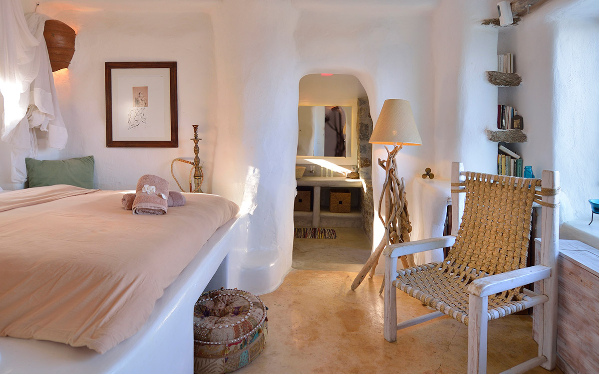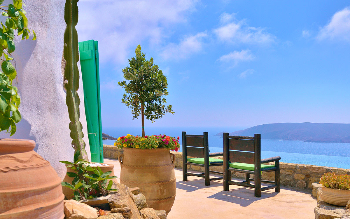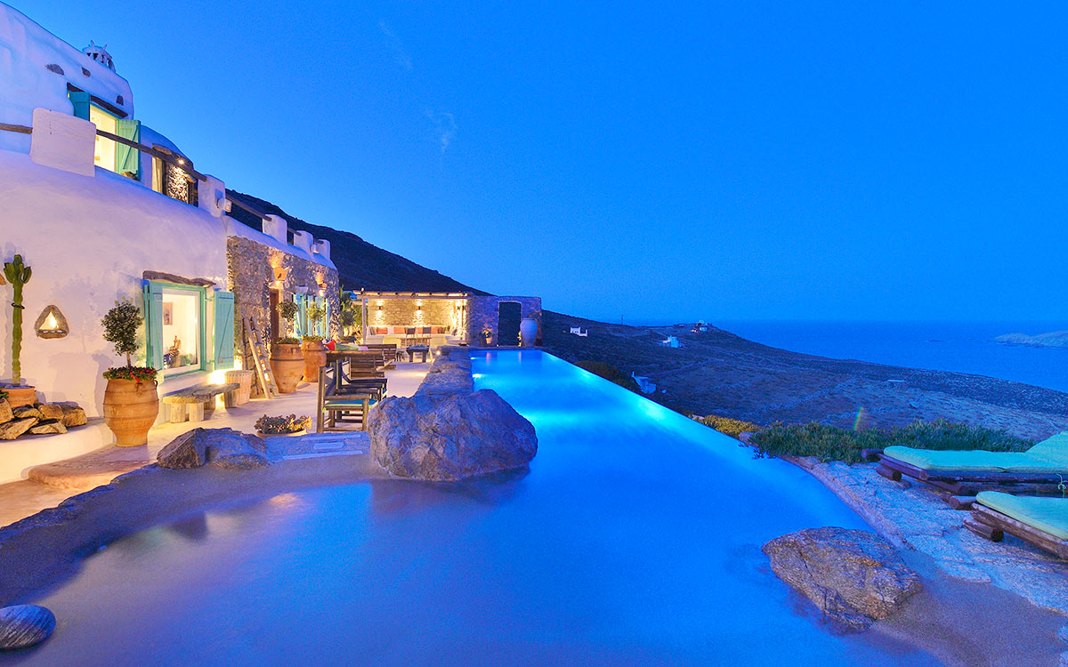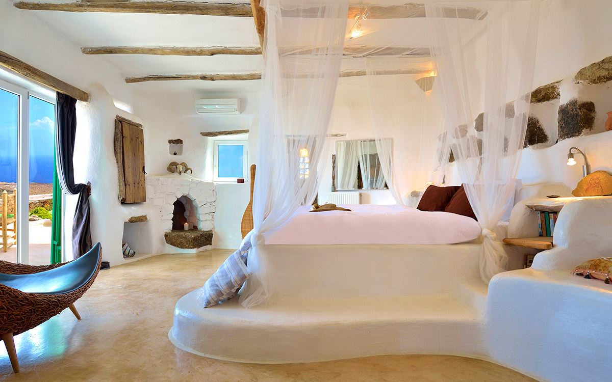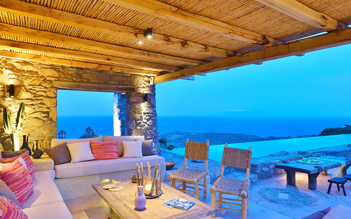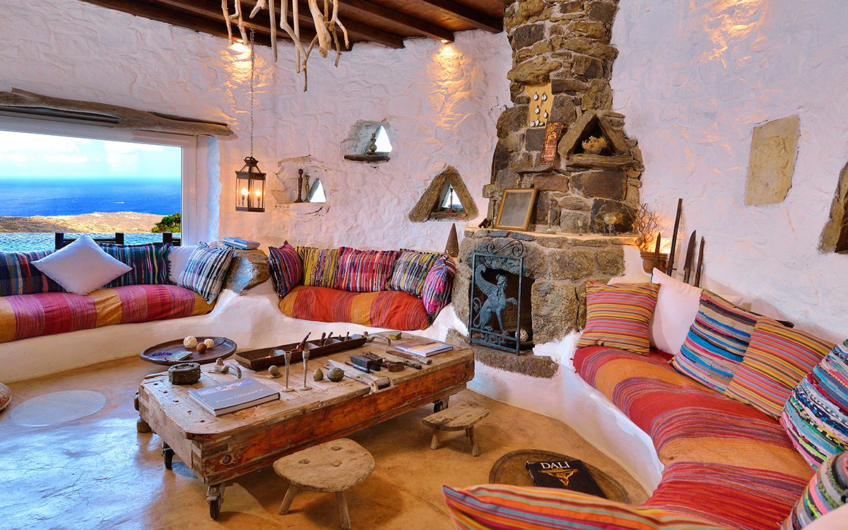 Drakothea villa is a charming, traditional Greek property overlooking Dragonissi Island and peaceful Lia Bay. Its design reflects the Mykonian country style, with its relaxed elegance and comfort. An impressive infinity lap pool features bare rock edges. Numerous plants, flowers and cacti surround this majestic estate. The villa includes an alfresco dining area, equipped with a barbecue-oven. It is ideal for entertaining while enjoying endless sea views.The villa features beautiful antiques and unique accents in its attractive living areas. Textured white walls and hallways carved into stone are dramatic flourishes. The open-plan kitchen is fully equipped. Adjacent, the formal dining room is furnished in a chic but simple style. Sheer, white drapes flow gracefully to separate this room from the entrance. The relaxed sitting room, round and carved from stone, has many antique object..
