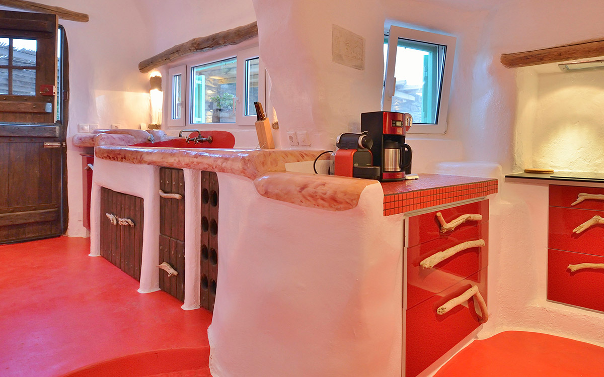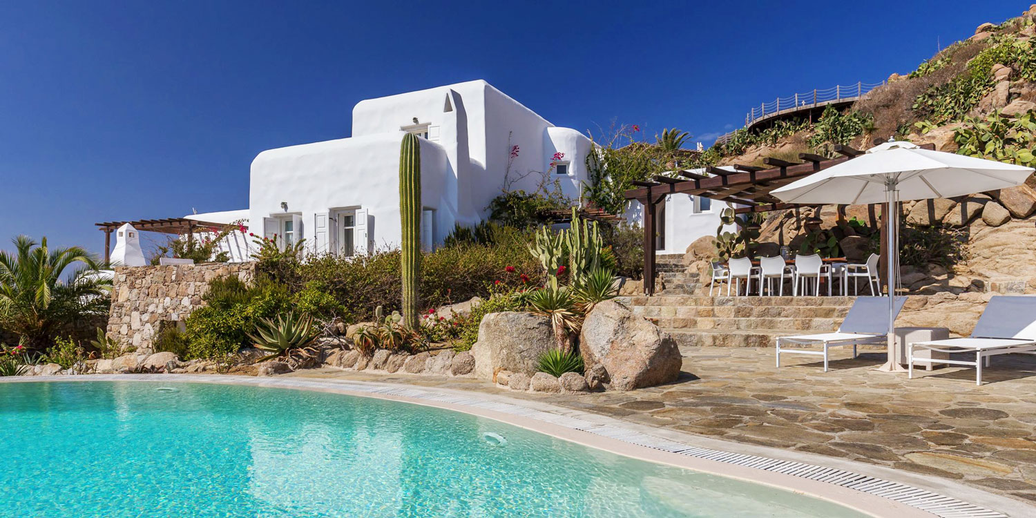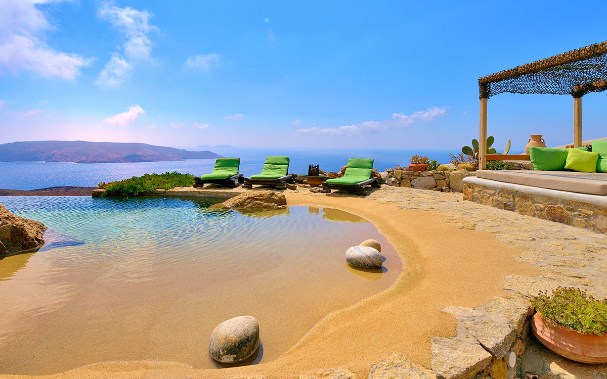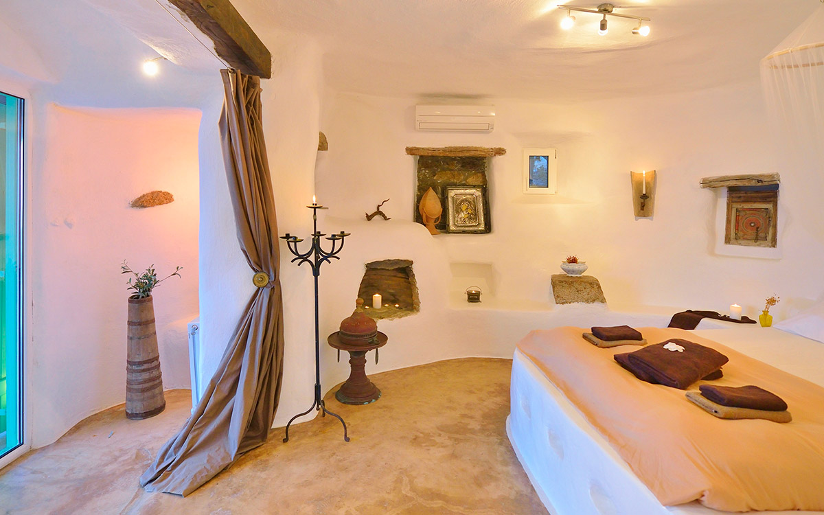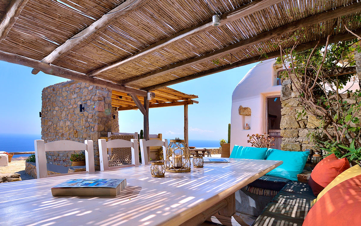 Drakothea villa is a charming, traditional Greek property overlooking Dragonissi Island and peaceful Lia Bay. Its design reflects the Mykonian country style, with its relaxed elegance and comfort. An impressive infinity lap pool features bare rock edges. Numerous plants, flowers and cacti surround this majestic estate. The villa includes an alfresco dining area, equipped with a barbecue-oven. It is ideal for entertaining while enjoying endless sea views.The villa features beautiful antiques and unique accents in its attractive living areas. Textured white walls and hallways carved into stone are dramatic flourishes. The open-plan kitchen is fully equipped. Adjacent, the formal dining room is furnished in a chic but simple style. Sheer, white drapes flow gracefully to separate this room from the entrance. The relaxed sitting room, round and carved from stone, has many antique object..