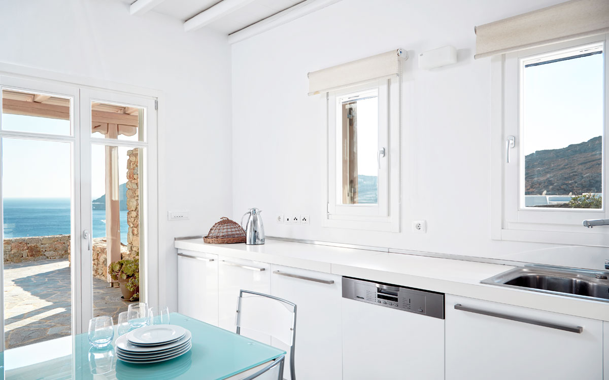 The Elia White Residence enjoys a privileged location, overlooking Elia Beach on Mykonos. Elia Beach is a long, golden sand beach; argueably the quietest and best beach on Myknonos. The protected waters are perfect for watersports, and a full array of watersport activities and equipment are available at Elia. Situated only ten kilometers from Mykonos town, and with dining and shopping venues also available at Elia, seclusion and convenience are well balanced.Built in typical Cycladic style, the three level villa hosts an exterior shaded pergola and ample pool decking. The pool area hosts outdoor dining facilities, including a built-in dining table, wet bar, and a barbecue. The private infinity edged pool provides the illusion of its waters spilling directly into the sea below.The interiors of the house are contemporary, with the stark white walls softened by smooth cu..