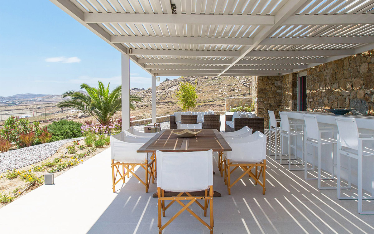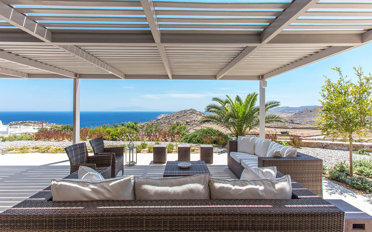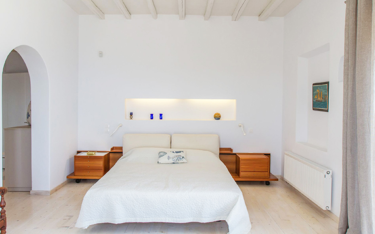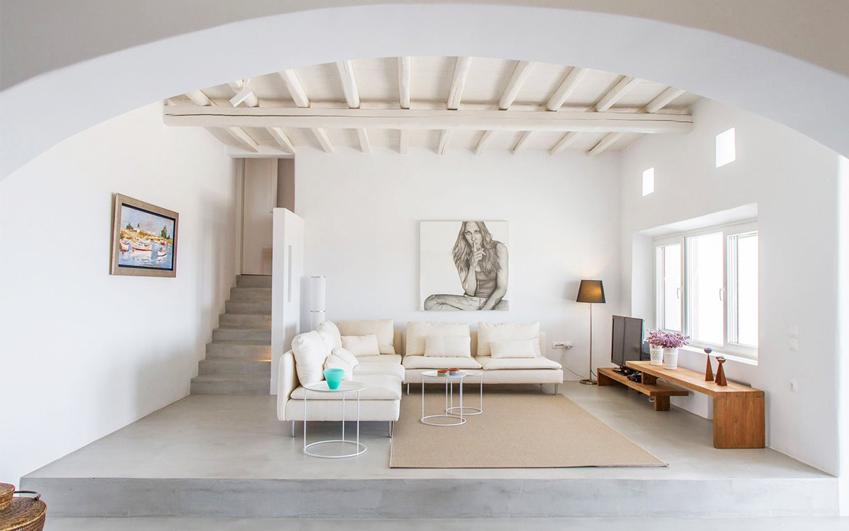 The charming summer residence enjoys a secluded location, with views over the picturesque countryside and blue waters of the Aegean. The outdoor spaces spread over various levels are designed to make the most of the panoramic views.A lovely garden surrounds the main lounge, bar-dining area and its large pergola. These are right next to the swimming pool, with its comfortable sunbeds. A further lounge spot and dining table are found above this area, just outside the kitchen.Both indoors and out great attention has been paid to detail in design, furnishings and amenities. The minimalist approach of the interior well suits the villa renovation undertaken by a famous architectural firm. Original cimentogonia combines with wooden elements and off-white or pastel-colored furnishings, giving it a distinguished ambience. The bedrooms offer great privacy and all the modern amenities. ..