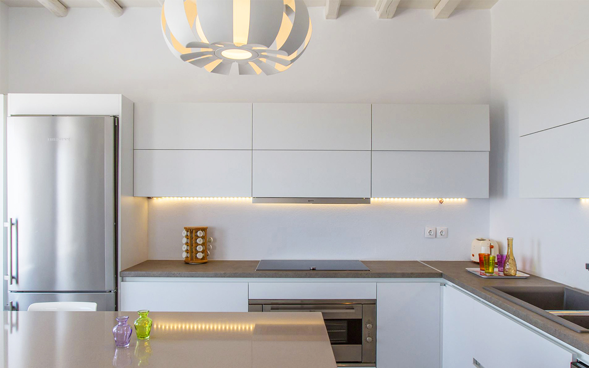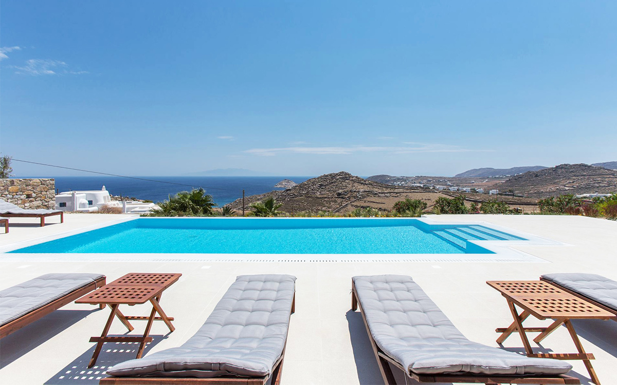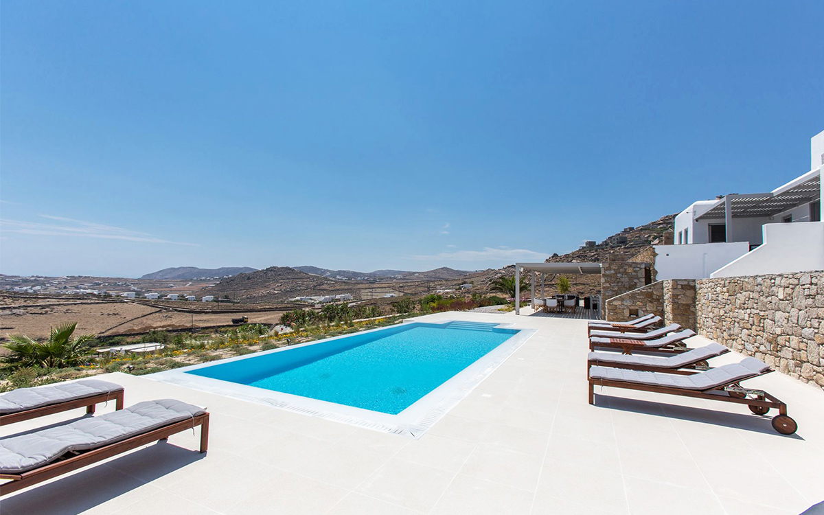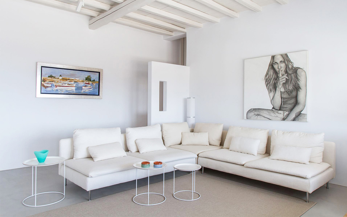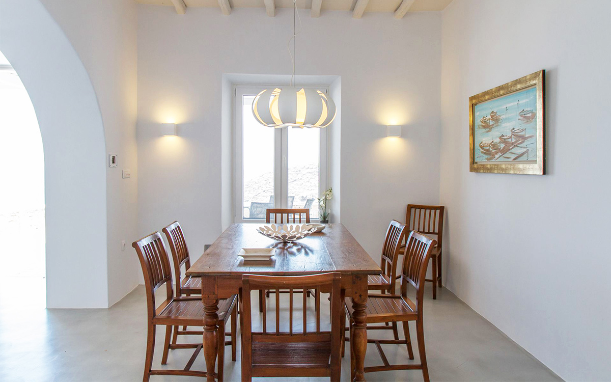 The charming summer residence enjoys a secluded location, with views over the picturesque countryside and blue waters of the Aegean. The outdoor spaces spread over various levels are designed to make the most of the panoramic views.A lovely garden surrounds the main lounge, bar-dining area and its large pergola. These are right next to the swimming pool, with its comfortable sunbeds. A further lounge spot and dining table are found above this area, just outside the kitchen.Both indoors and out great attention has been paid to detail in design, furnishings and amenities. The minimalist approach of the interior well suits the villa renovation undertaken by a famous architectural firm. Original cimentogonia combines with wooden elements and off-white or pastel-colored furnishings, giving it a distinguished ambience. The bedrooms offer great privacy and all the modern amenities. ..