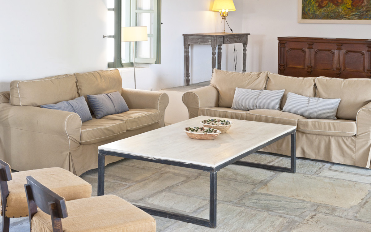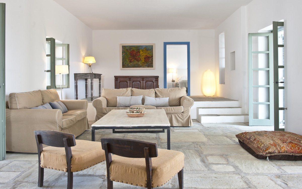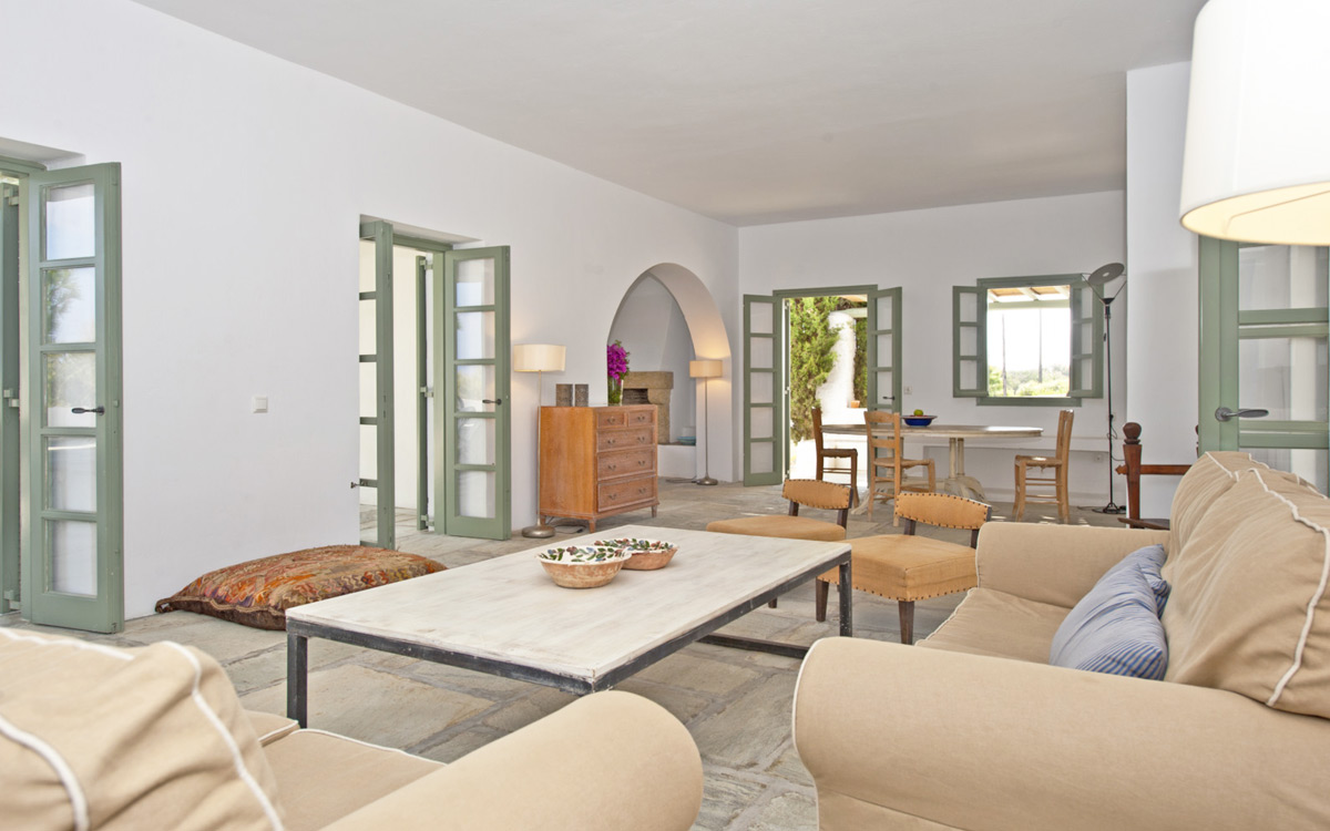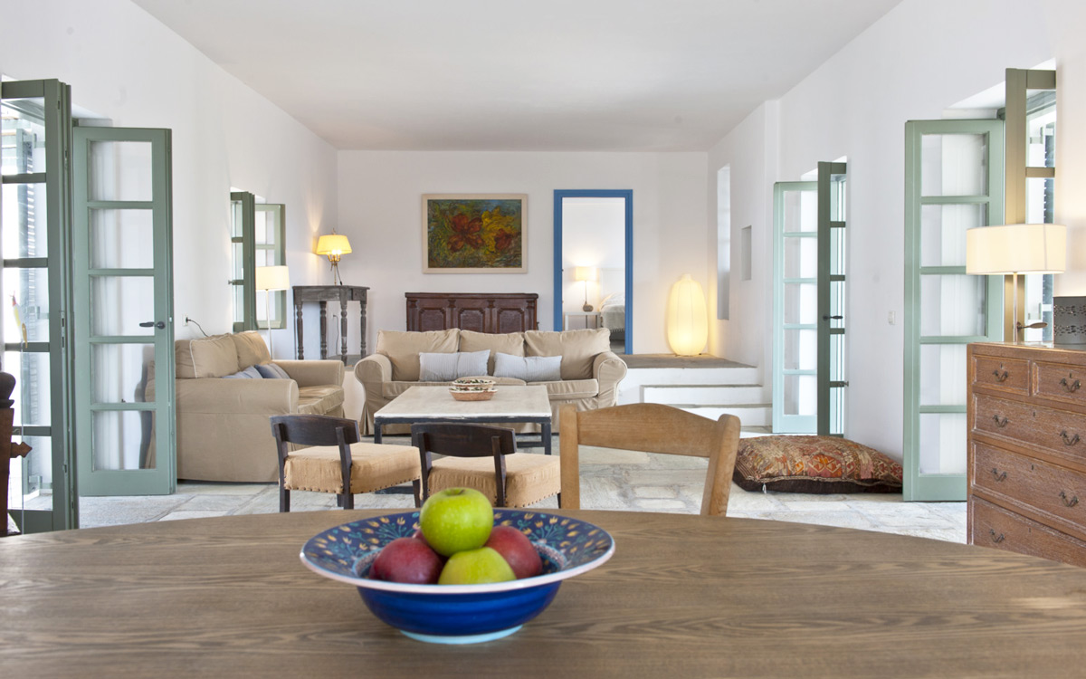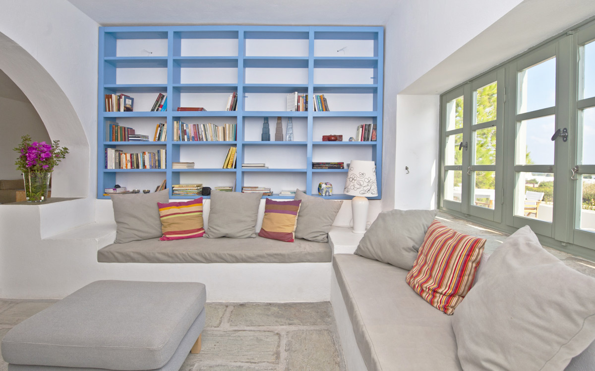 Elia Villa is located within meters of the beach at Santa Maria on Paros, with direct beach access. Paros is known for its beautiful beaches and scenic landscapes. Wind surfing, biking, trekking, sailing and many other outdoor activities are nearby.This traditional Cycladic villa features various large terraces. An interior courtyard features outdoor dining facilities, private pool, barbecue, an outdoor shower and guest bathroom. There is a guest suite adjacent to this courtyard, providing three twin beds and private bathroom with shower; ideal accomodations for teenagers or older children.The ground floor hosts the open plan living areas including the living room, office nook, TV room and library, a dining area and a fully equipped kitchen. The T.V. room and library offers a fireplace. Front and rear terraces open from the open living area and host outdoor dining..
