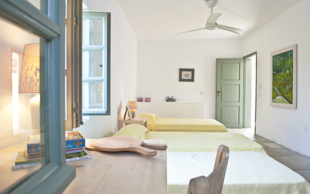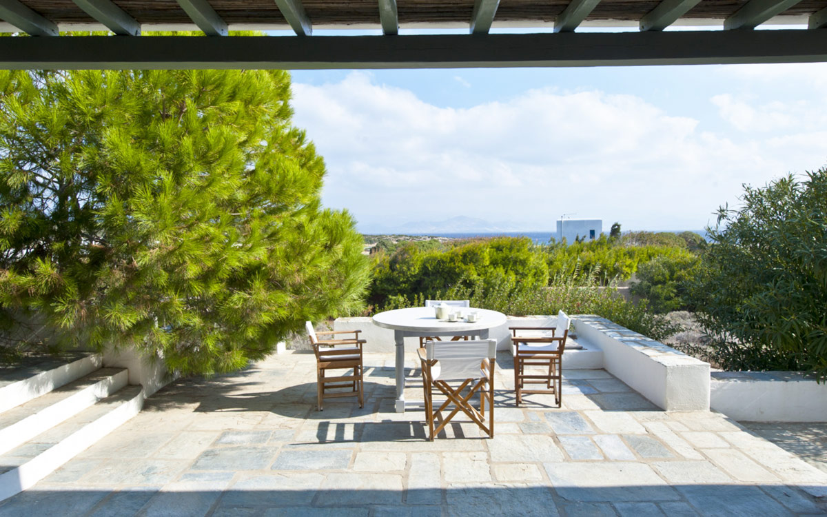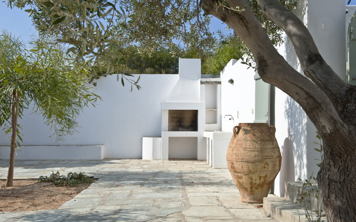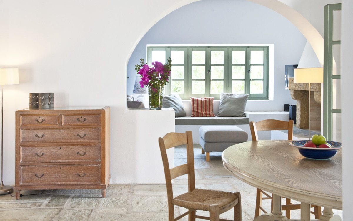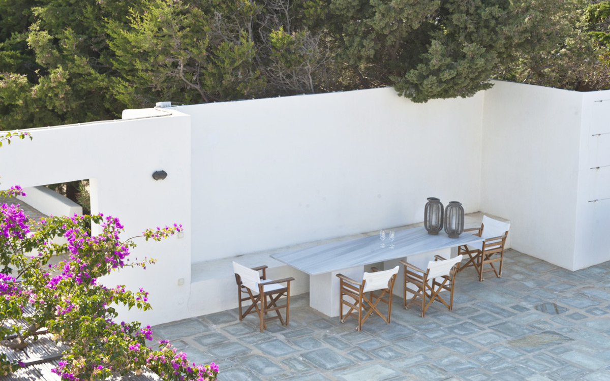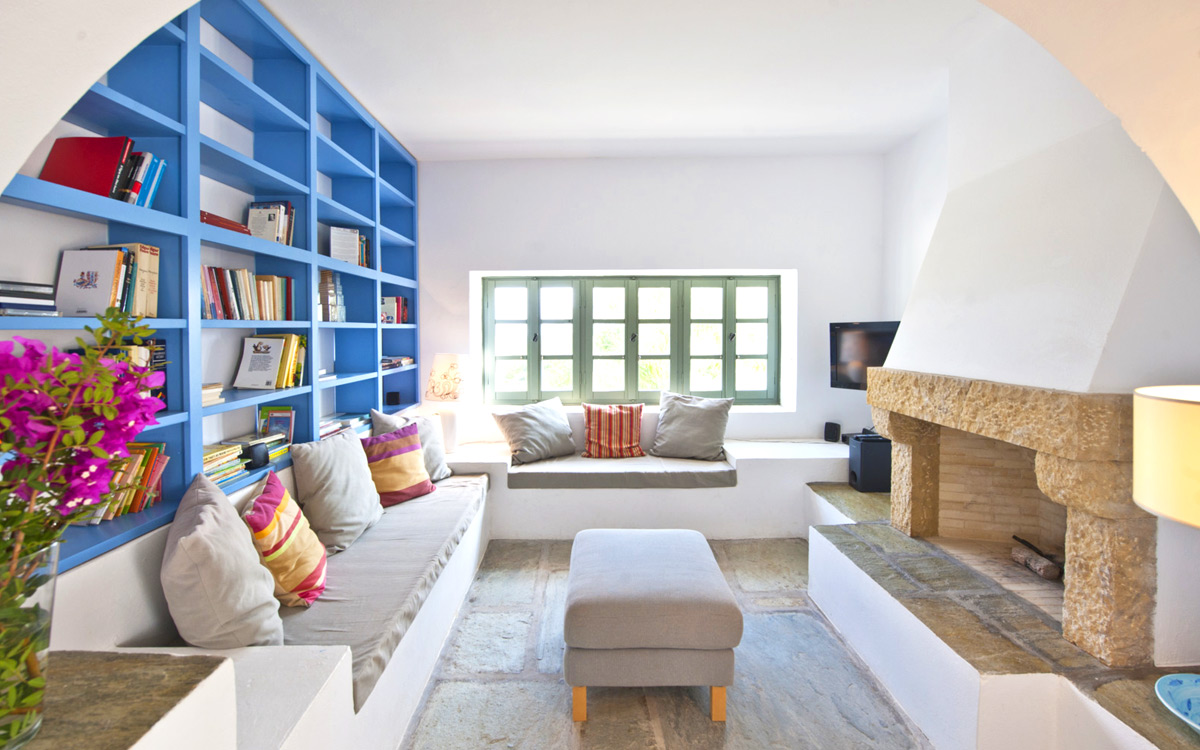 Elia Villa is located within meters of the beach at Santa Maria on Paros, with direct beach access. Paros is known for its beautiful beaches and scenic landscapes. Wind surfing, biking, trekking, sailing and many other outdoor activities are nearby.This traditional Cycladic villa features various large terraces. An interior courtyard features outdoor dining facilities, private pool, barbecue, an outdoor shower and guest bathroom. There is a guest suite adjacent to this courtyard, providing three twin beds and private bathroom with shower; ideal accomodations for teenagers or older children.The ground floor hosts the open plan living areas including the living room, office nook, TV room and library, a dining area and a fully equipped kitchen. The T.V. room and library offers a fireplace. Front and rear terraces open from the open living area and host outdoor dining..