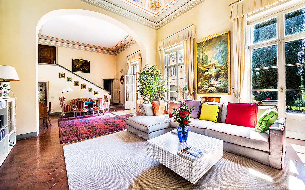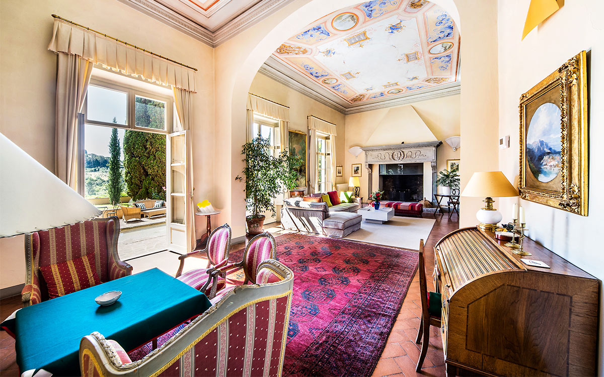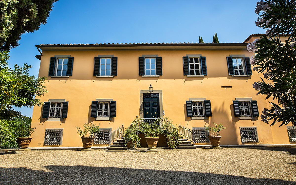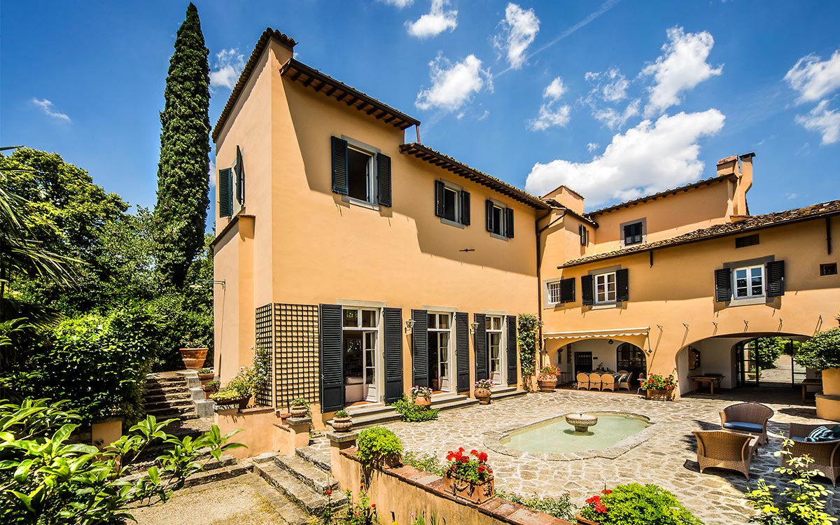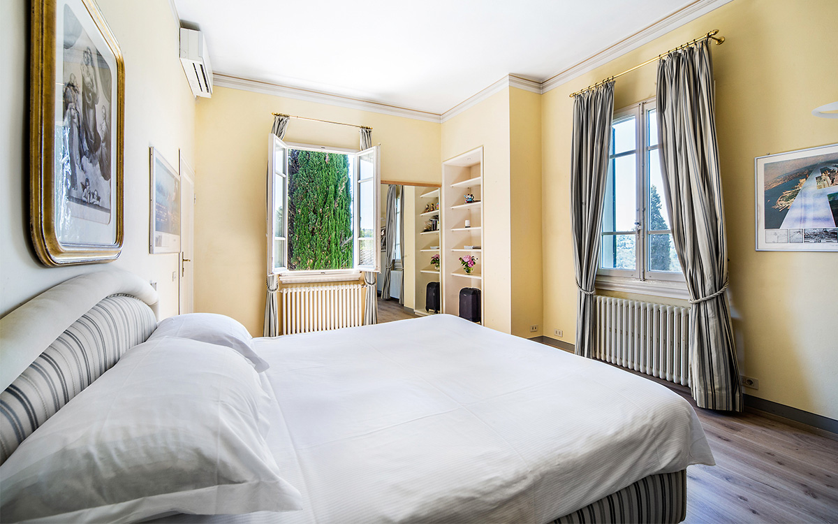 Just minutes away by car or bus from the historical center, the freshly renovated Villa Duca is set atop one of most prestigious hills of Florence, peacefully surrounded by olive groves, cypress trees, and beautifully manicured gardens. This elegant luxury three-story villa features a picturesque panoramic courtyard with direct views of the Florentine countryside. A glorious boulevard of grand cypress trees leads the guests to this sun-flooded home, perfectly suited for sophisticated living and entertaining.