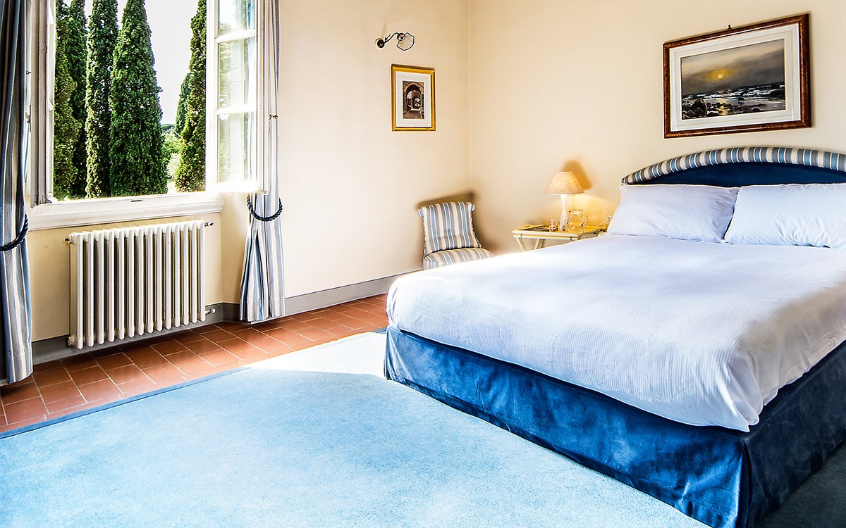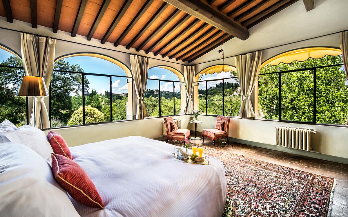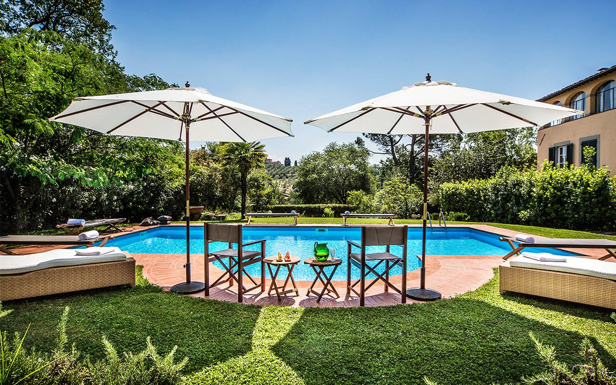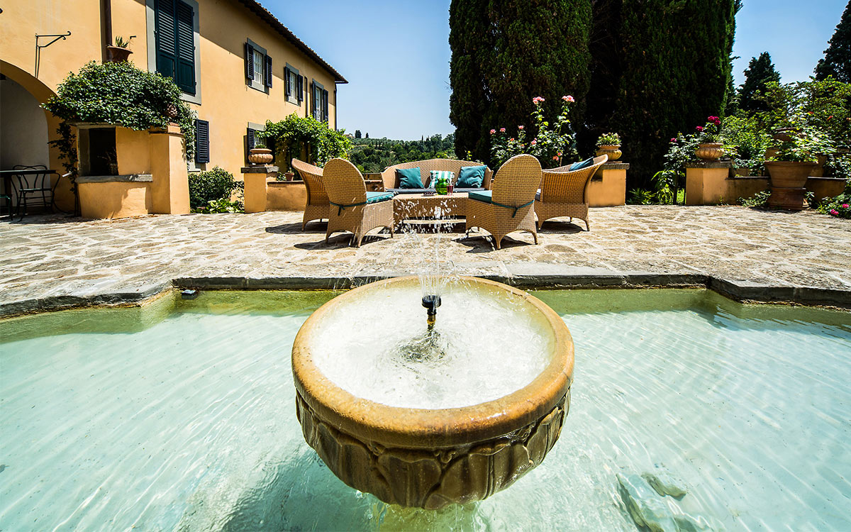 Just minutes away by car or bus from the historical center, the freshly renovated Villa Duca is set atop one of most prestigious hills of Florence, peacefully surrounded by olive groves, cypress trees, and beautifully manicured gardens. This elegant luxury three-story villa features a picturesque panoramic courtyard with direct views of the Florentine countryside. A glorious boulevard of grand cypress trees leads the guests to this sun-flooded home, perfectly suited for sophisticated living and entertaining.