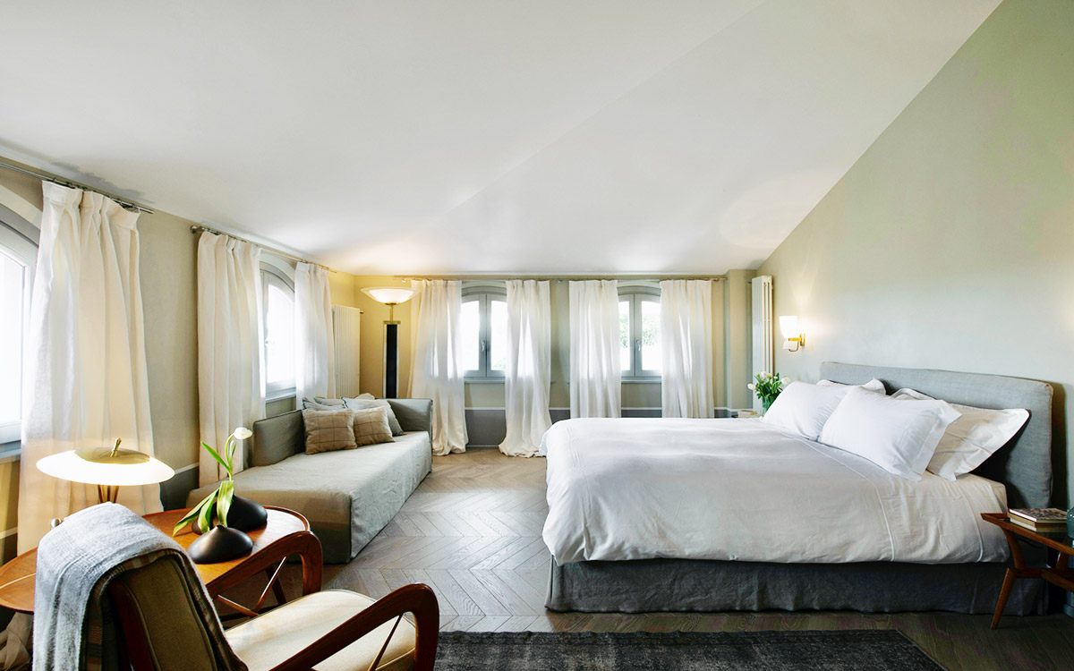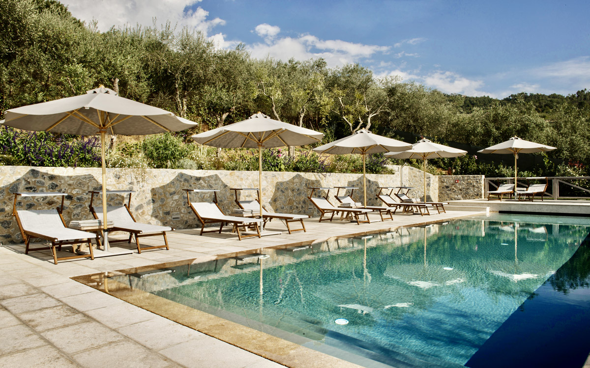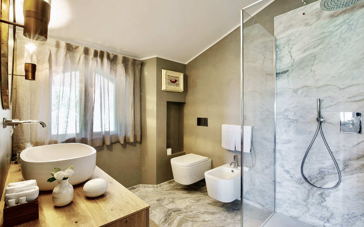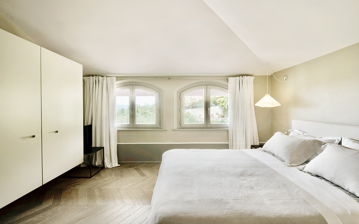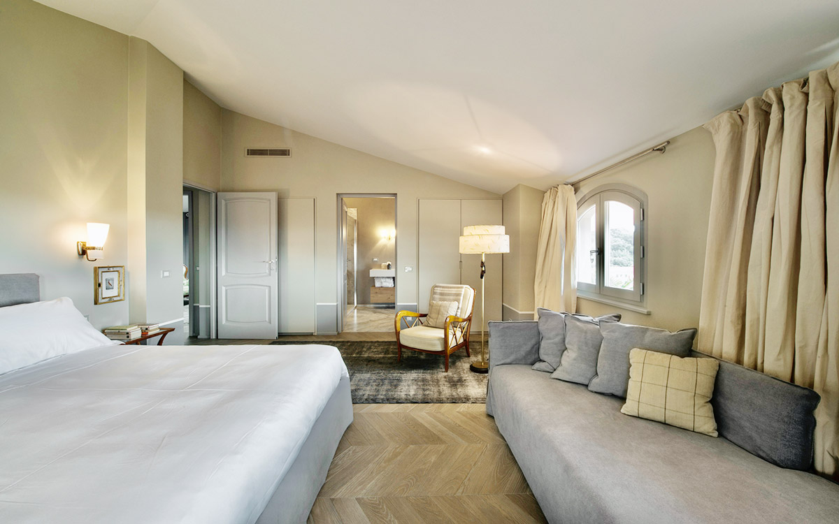 Nestled in the hills that surround Forte dei Marmi and its coast, this estate offers eight bedrooms decorated in elegant style with color-washed walls in pale shades, contemporary fabrics, books and items, which lend a very personal touch. The home design approached with research in the estate contextual, technical, and historical contexts, results in a new-classic style with stone, resin floors, quality washed wooden boards and marble. Modern, comfortable and soothing, this is a bohemian-chic retreat full of light and a welcoming vibe. The living areas include two large rooms for watching TV or reading a book in front of the fireplace, the breakfast area with a fully equipped open kitchen. The refined atmosphere is also enhanced by its light shades of nude and grey, enriched with vintage pieces and Italian design ’50s and’ 60s pieces. The style encompasses traditional elements brought into the now with updated add-on’s for today’s lifestyles: there is a heated pool equipped with beach umbrellas and deck loungers, offering a breath-taking 360° view of the coast; for fitness enthusiasts, the estate features a shady corner gym equipped with Technogym machines, a comfortable sauna with an outdoor shower. The lush garden, studded with Mediterranean plants, citrus, and flowers, enables guests to enjoy many corners to regenerate and to live a relaxing time.